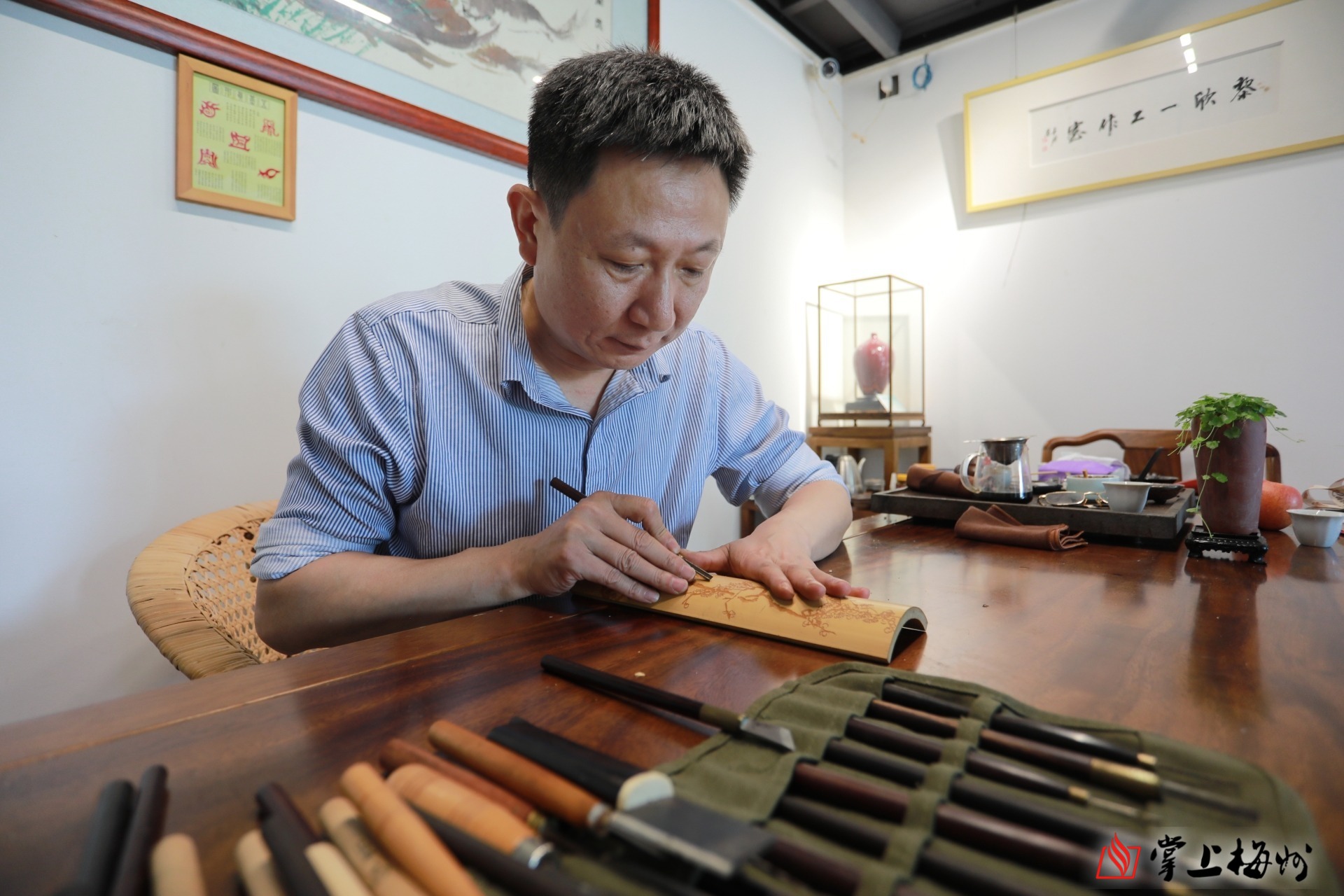 在黎欣一的工作室,记者见到满柜子的竹刻作品展示,成品从竹片、扇骨、杯垫、笔筒到香盒,内容从花鸟虫鱼到篆书、隶书、楷书等文字书法,让人目不暇接。“我的作品灵感来源于中国传统的书画题材,将其糅合到竹刻中,更显意趣。”黎欣一告诉记者,竹刻作品从构思到竣工,视其难易程度,大概需要半个月至一个月的时间创作,最难的一件作品他大概雕刻了一万多刀才完成。