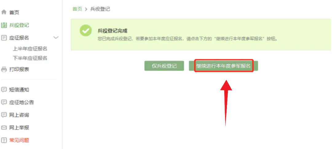 第五步,如果已经进行兵役登记,登入系统后就会跳转至以下界面,应征青年只需要点击“继续进行本年参军报名”去完善个人信息。