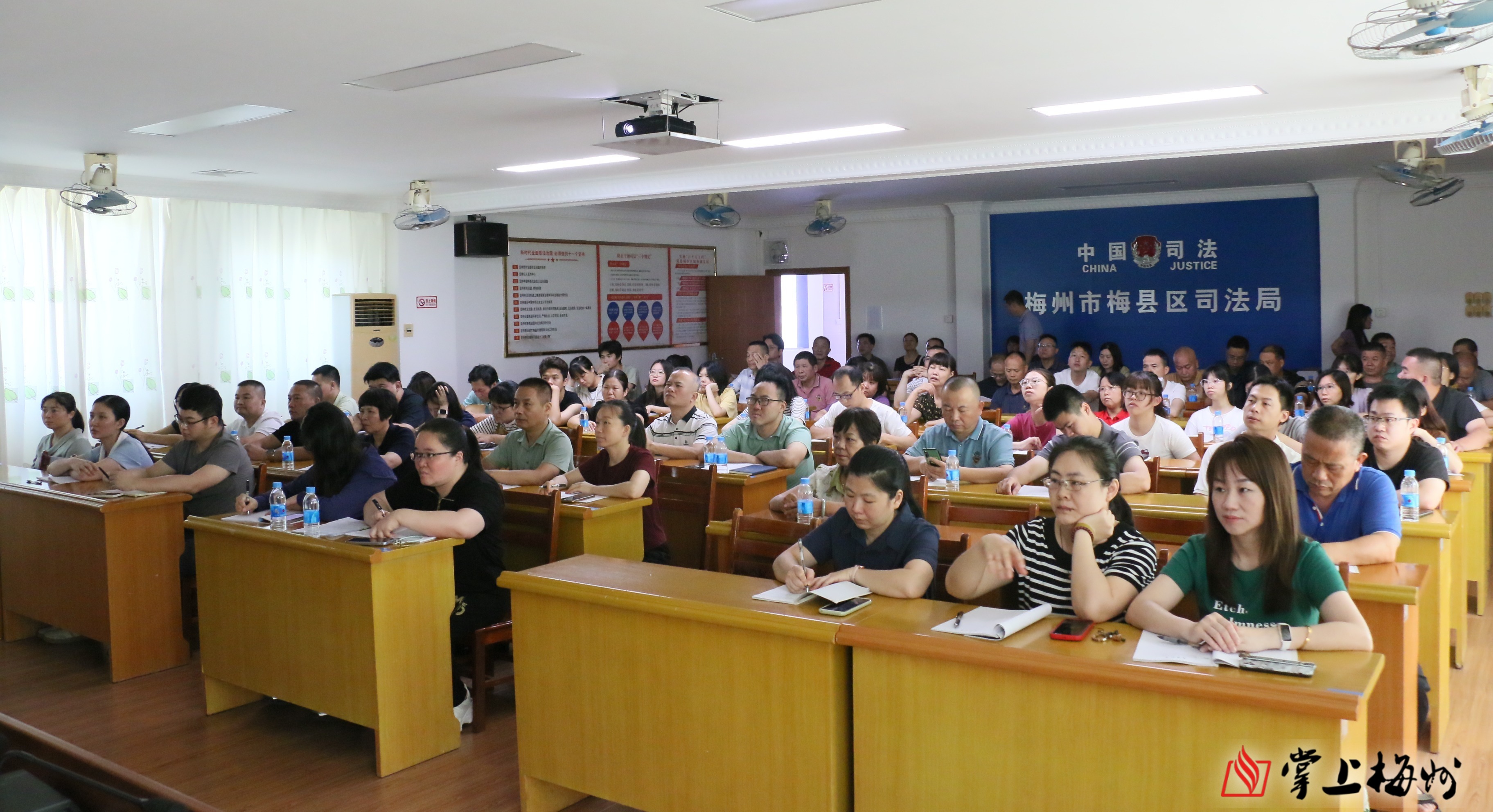 掌上梅州讯 6月27日,梅县区举办新时代法治人才培训班暨人民调解员和“法律明白人”业务培训班。梅县区19个司法所全体干部及扶大高管会、程江镇、新城办辖区内共27个村(社区)调解委员会派员,共计近百人参加培训会。