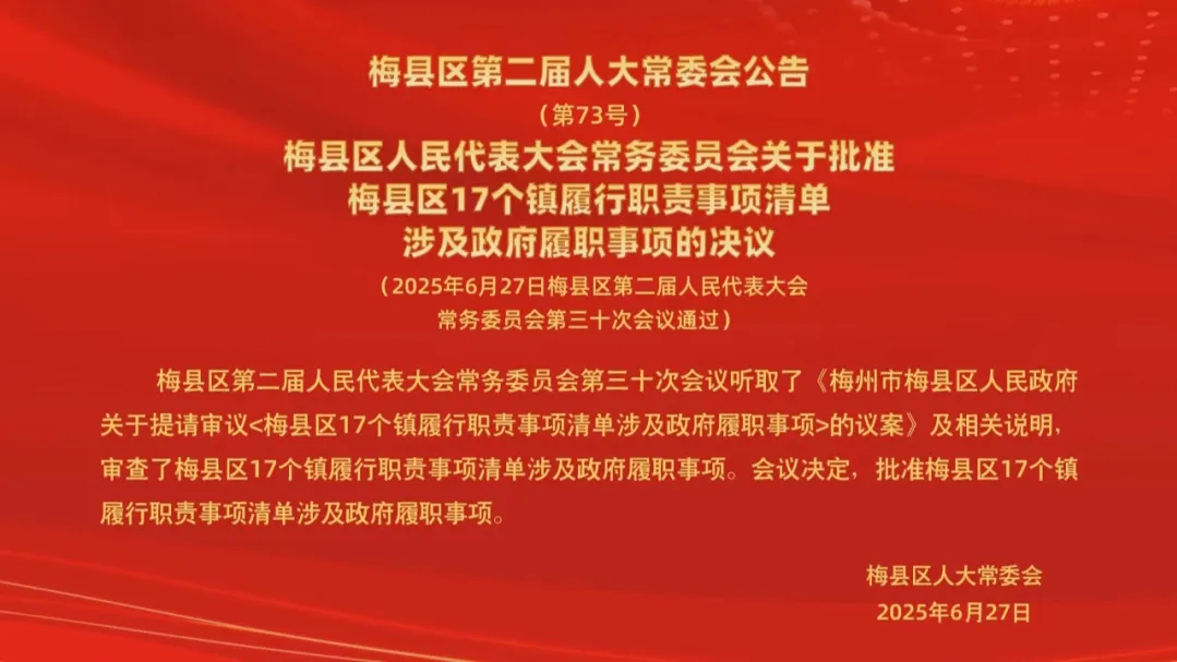 会议听取审议了区政府关于推进“健康梅县”建设情况报告、区人大常委会执法检查组关于检查《中华人民共和国老年人权益保障法》《广东省老年人权益保障条例》实施情况报告,批准了梅县区17个镇履行职责事项清单涉及政府履职事项的决议,对区发展改革局、区应急管理局、区政务服务和数据管理局等3个职能单位开展工作评议并进行满意度测评,审议通过了有关人事任免事项。
