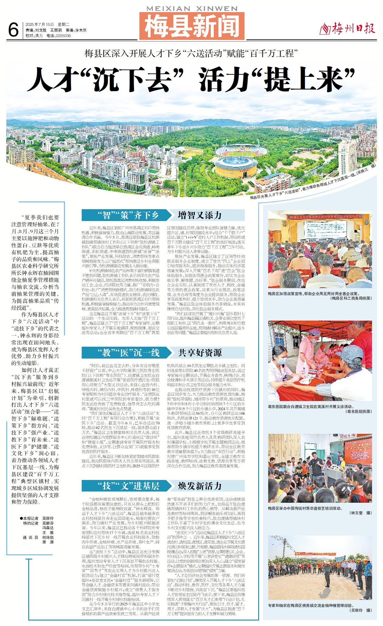 如何让人才真正“沉下去”服务到乡村振兴最前线?近年来,梅县区以“启航计划”为牵引,创新打出人才下乡“六送活动”组合拳——“送智下乡”解难题、“送策下乡”指方向、“送技下乡”强产业、“送教下乡”育未来、“送医下乡”护健康、“送文化下乡”润心田,着力推动各领域人才下沉基层一线,为梅县区建设“百千万工程”典型区镇村、实现城乡区域协调发展提供坚强的人才支撑和智力保障。