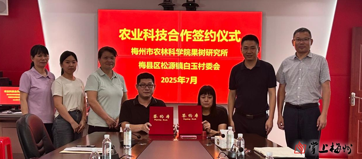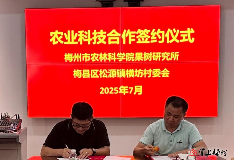 掌上梅州讯 日前,在梅县区松源镇人民政府和广州市派驻梅州市梅县区松源镇驻镇帮镇扶村工作队(以下简称“工作队”)共同见证下,梅州市农林科学院果树研究所(以下简称“果树研究所”)与梅县区松源镇白玉村、横坊村签订农业科技合作协议,通过技术赋能助力松源镇特色农业高质量发展。