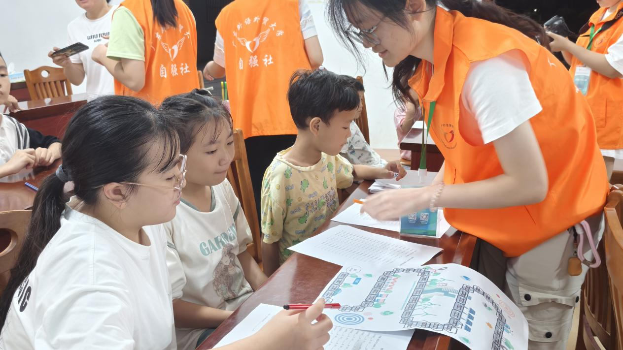 依托乡村儿童心理,服务队在梅南镇开设特色“第二课堂”主题活动,采用“1个目标,3种方式,N个内容”的模式,将队员专业与儿童兴趣巧妙融合。在儿童理财小课堂上,队员们把大富翁棋牌游戏改造为“小小理财家”实践场景,通过模拟“收入分配”“风险投资”等环节,让20余名儿童在游戏中理解储蓄与消费的意义;海报设计课堂上,队员们从色彩搭配、版式设计等基础理论讲起,引导孩子们以“资助政策”为主题创作宣传海报;心理健康课上,队员们通过“情绪小怪兽”绘画、团体小游戏等形式,引导孩子们学会识别与管理情绪,累计参与学生60余人次。