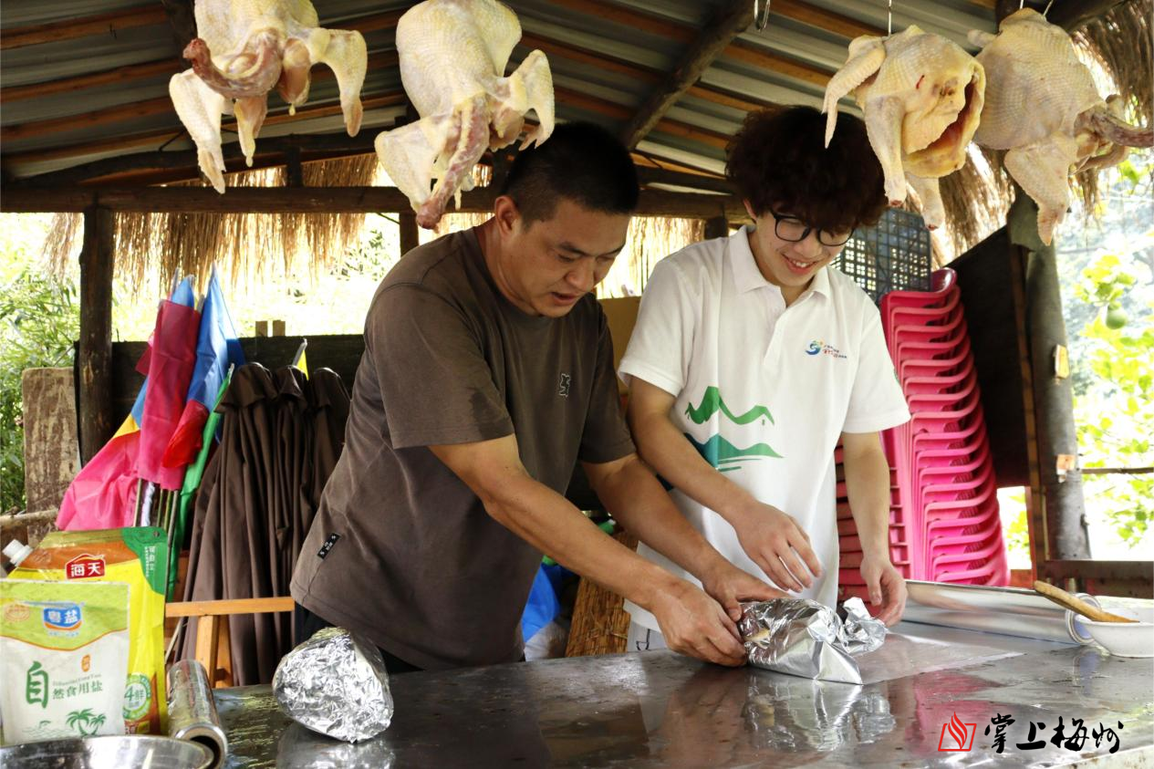 铭记历史是为了更好地开创未来。实践队聚焦水美村特色产业,深入田间地头与生产一线调研。观察蜂农割取金黄原蜜,体验柴火窑鸡的香气四溢,记录“红军酒”酿造技法,探访生态茶园与百香果基地,了解新农人的尝试与期盼。在与水美村党支部书记罗苑华的交流中,罗书记肯定了红色产业对村里经济发展和红色精神传承的带动作用,但他也直指关键短板:“目前主要的缺点是,农户对产品的包装意识不强。”针对这一痛点,实践队发挥专业所长,为蜂蜜、窑鸡、“红军酒”等水美村特色农产品设计了一系列融合地方文化元素的包装并拍摄制作了宣传短片,助力产业知名度提升、销售增长与升级发展。