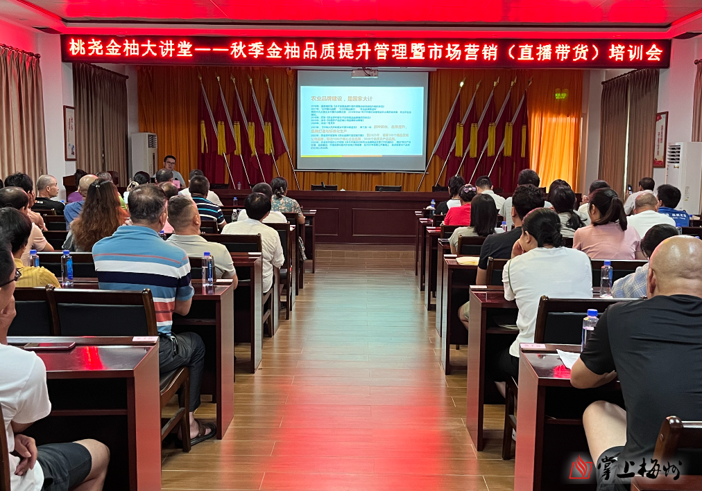 掌上梅州讯 眼下正值蜜柚(早熟柚)即将成熟下树的关键时期,为进一步提升柚果品质、拓宽销售渠道,助力金柚产业高质量发展,日前,梅县区桃尧镇在桃尧镇政府举办桃尧金柚大讲堂——秋季金柚品质提升管理暨市场营销(直播带货)培训会,吸引了本土柚果经营主体、种植大户等约50人前来参加、充电赋能,为即将到来的金柚采收季做好充分准备。
