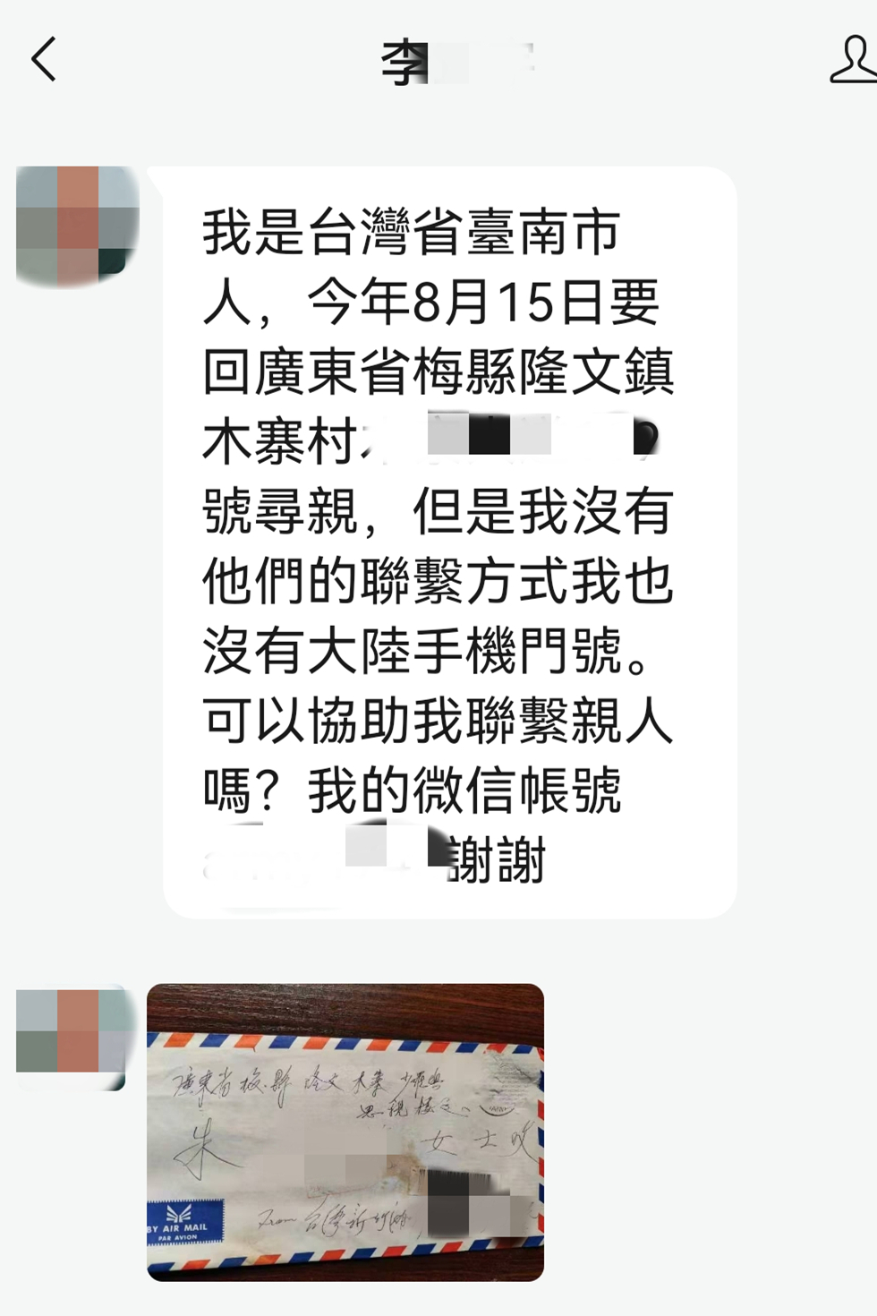 事情的开端,是一封尘封近四十载的泛黄信封。台胞李先生于近日通过“平安梅县”公众号后台留言,将这封信发给了梅县公安民警。李先生保存的信封上的地址与姓名,承载着台胞李先生微茫的期冀,是他念念不忘的亲人朱女士在梅县隆文镇的旧迹,更是他跨越海峡追寻血脉的唯一线索。