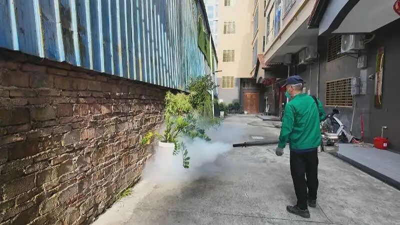 在所里村骏景豪庭的行动现场,志愿者使用喷雾设备对房前屋后、地下停车场、垃圾收集点、绿化带、水域周边等蚊虫易孳生的公共区域进行“地毯式”的消杀作业。同时,村干部上门与住户一起进行大扫除,清理卫生死角和积水,最大限度降低蚊虫密度,清除蚊虫孳生地。