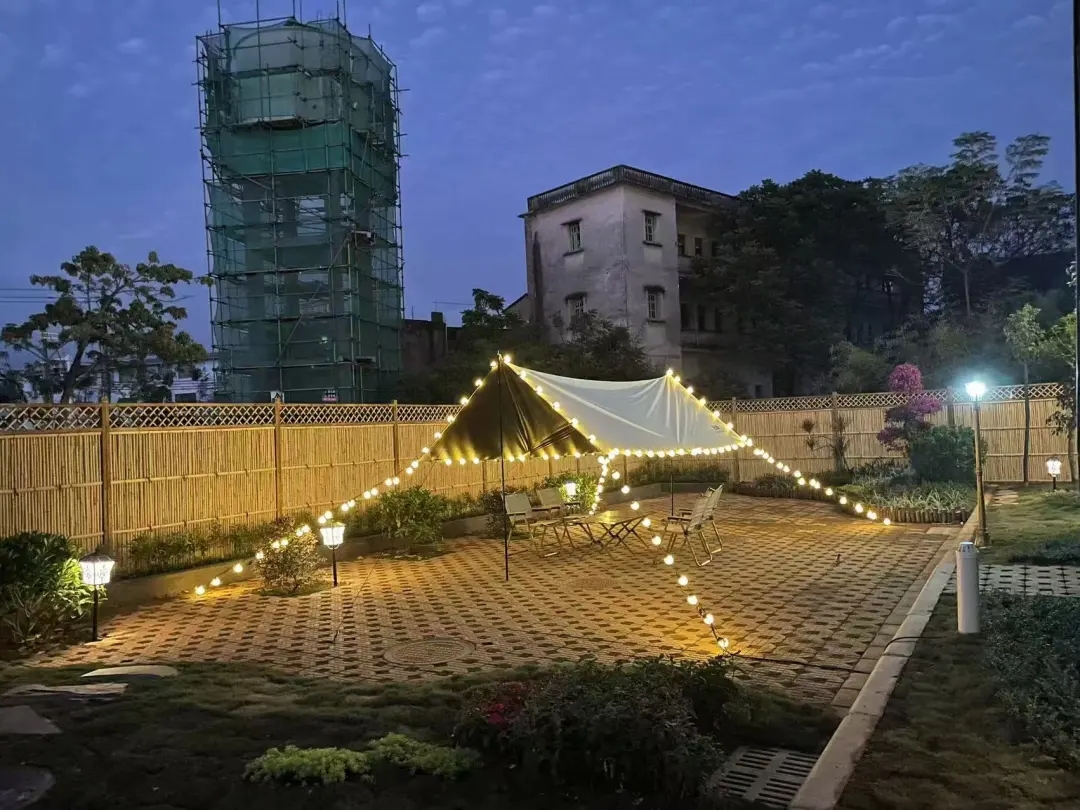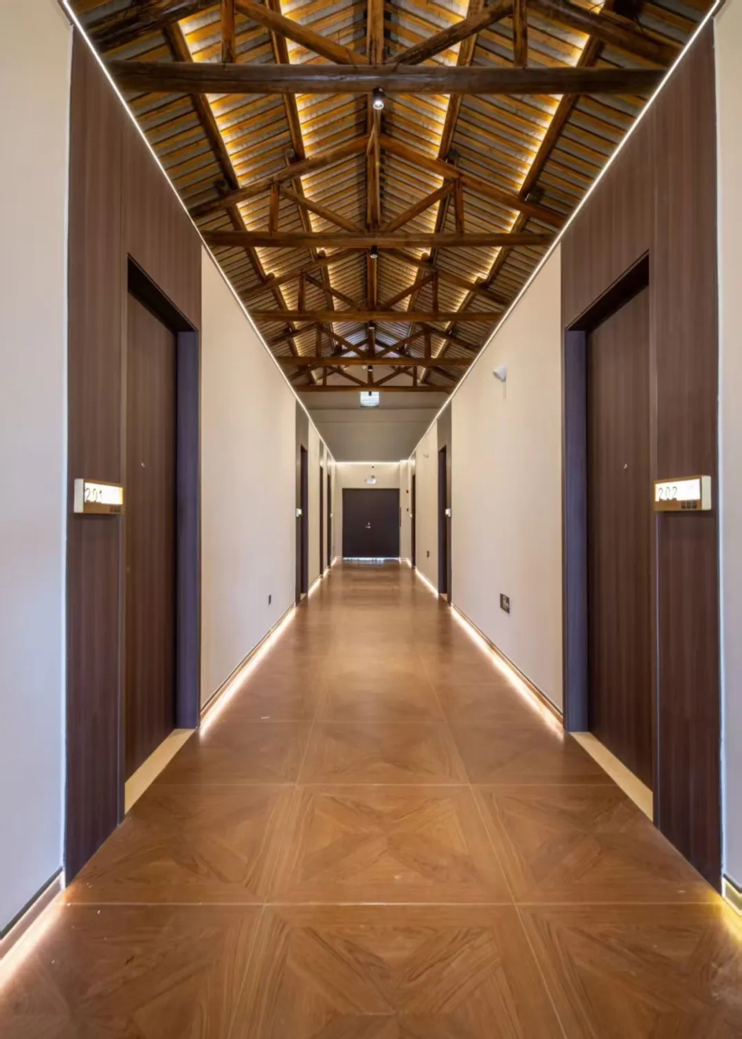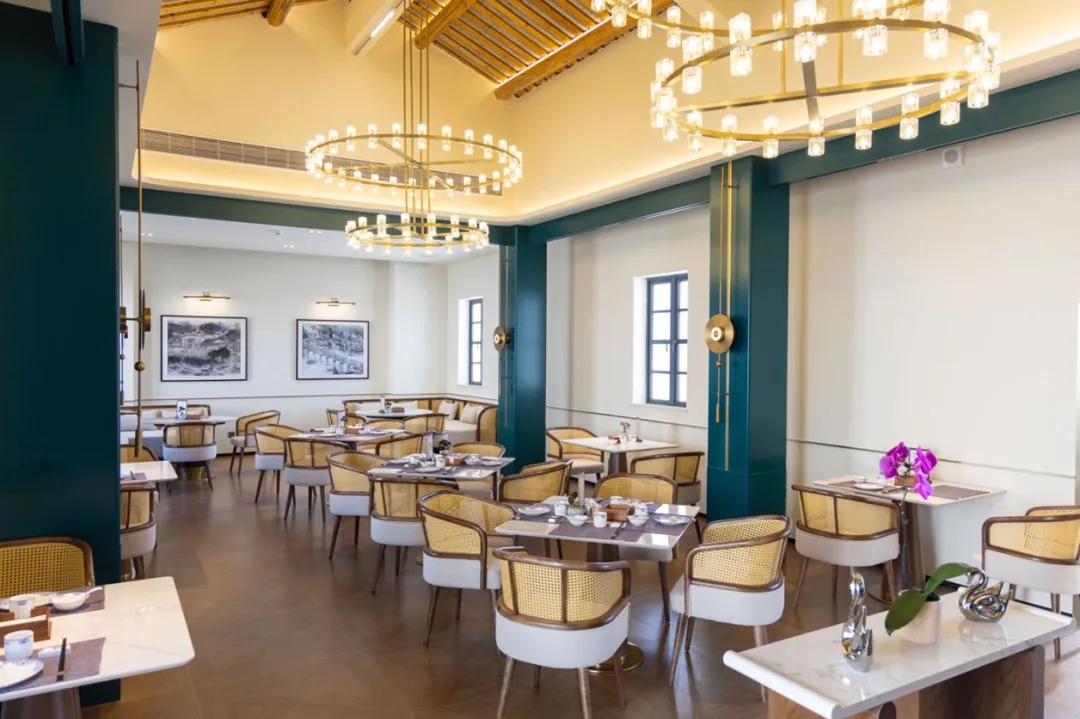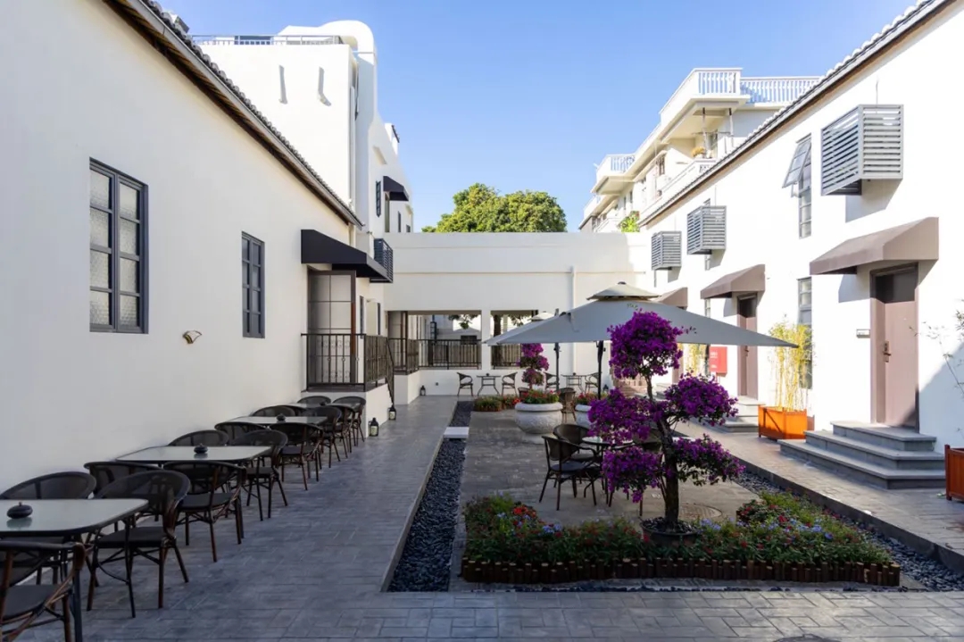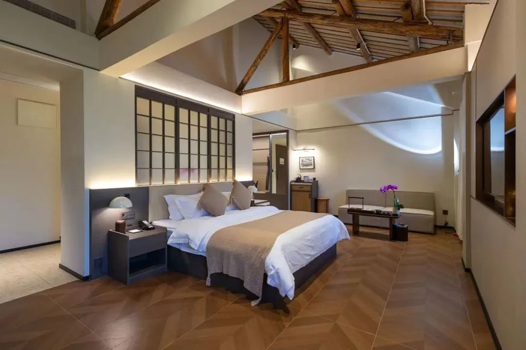 酒店设计灵感源自客家围屋与“下南洋”航船,将还原的修缮手法与现代美学思考相结合,以“绣花功夫”打造构式经典、间隔有度、恬然舒适的地标式建筑,属于客家传统建筑材质的青瓦、木构、花窗、版筑夯墙、老砖等元素,质感丰富又底蕴相彰,南洋样式的时钟、复古的落地暖灯、融入客家传统纹样的屏风隔挡,让时光染上松口历史文化韵味。