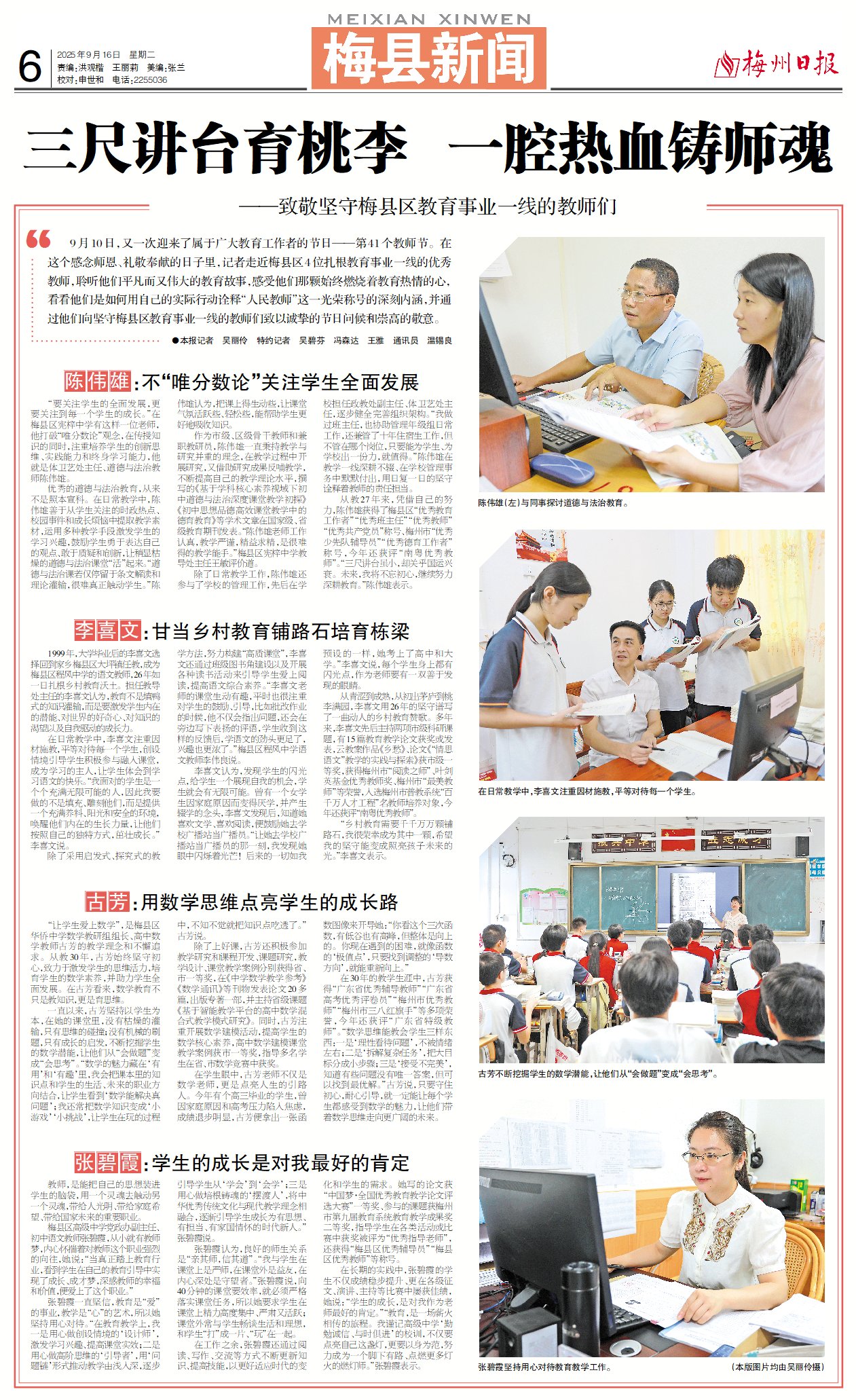9月10日,又一次迎来了属于广大教育工作者的节日——第41个教师节。在这个感念师恩、礼敬奉献的日子里,记者走近梅县区4位扎根教育事业一线的优秀教师,聆听他们平凡而又伟大的教育故事,感受他们那颗始终燃烧着教育热情的心,看看他们是如何用自己的实际行动诠释“人民教师”这一光荣称号的深刻内涵,并通过他们向坚守梅县区教育事业一线的教师们致以诚挚的节日问候和崇高的敬意。