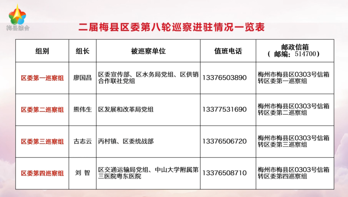 根据梅县区委巡察工作统一部署,2025年9月下旬至2025年12月下旬,开展二届区委第八轮巡察工作,本轮对1个乡镇、6个区直单位和1家医院进行巡察,近日,梅县区委4个巡察组已全部完成进驻工作。