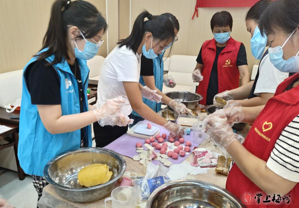活动当天,社工与志愿者聚集在一起亲手制作冰皮月饼,从和面、包馅、压模到包装,大家认真细致,将心意融入每一个环节。
