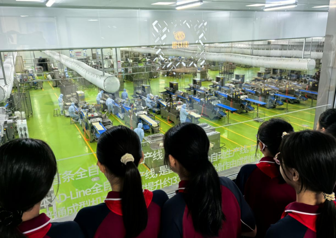 隔着明亮的参观走廊,同学们亲眼目睹了自动化生产线流程,对现代食品工业的智能化、标准化有了直观认识,也对“科技改变生产”有了更深的理解。