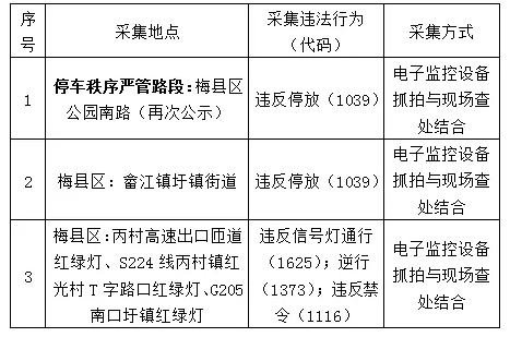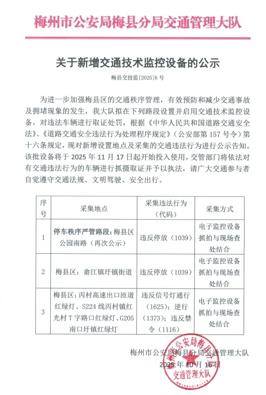 为进一步加强梅县区的交通秩序管理,有效预防和减少交通事故及拥堵现象的发生,梅县分局交通管理大队拟在下列路段设置并启用交通技术监控设备,对违法车辆进行取证处罚,根据《中华人民共和国道路交通安全法》、《道路交通安全违法行为处理程序规定》(公安部第157号令)第十六条规定,现对新增设置地点及采集的交通违法行为进行公示告知。该批设备将于2025年11月17日起开始投入使用,交管部门将依法对有交通违法行为的车辆进行抓摄取证并予以执法,请广大交通参与者自觉遵守交通法规、文明驾驶、安全出行。