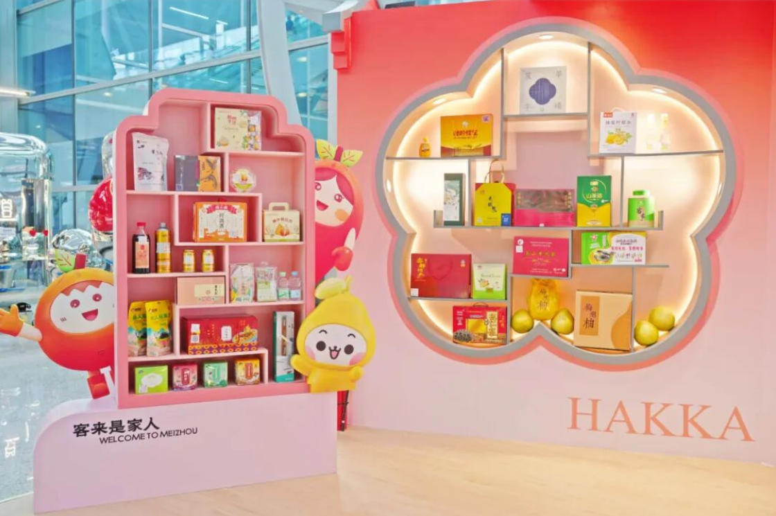 走进展台,雁南飞绿茶、雁球牌米粉等梅县农业龙头企业的名优产品整齐陈列。国内外旅客只需扫码下单,即可品尝“梅州味道”、感受“客家匠心”,以此开启一场“云游梅县”之旅。