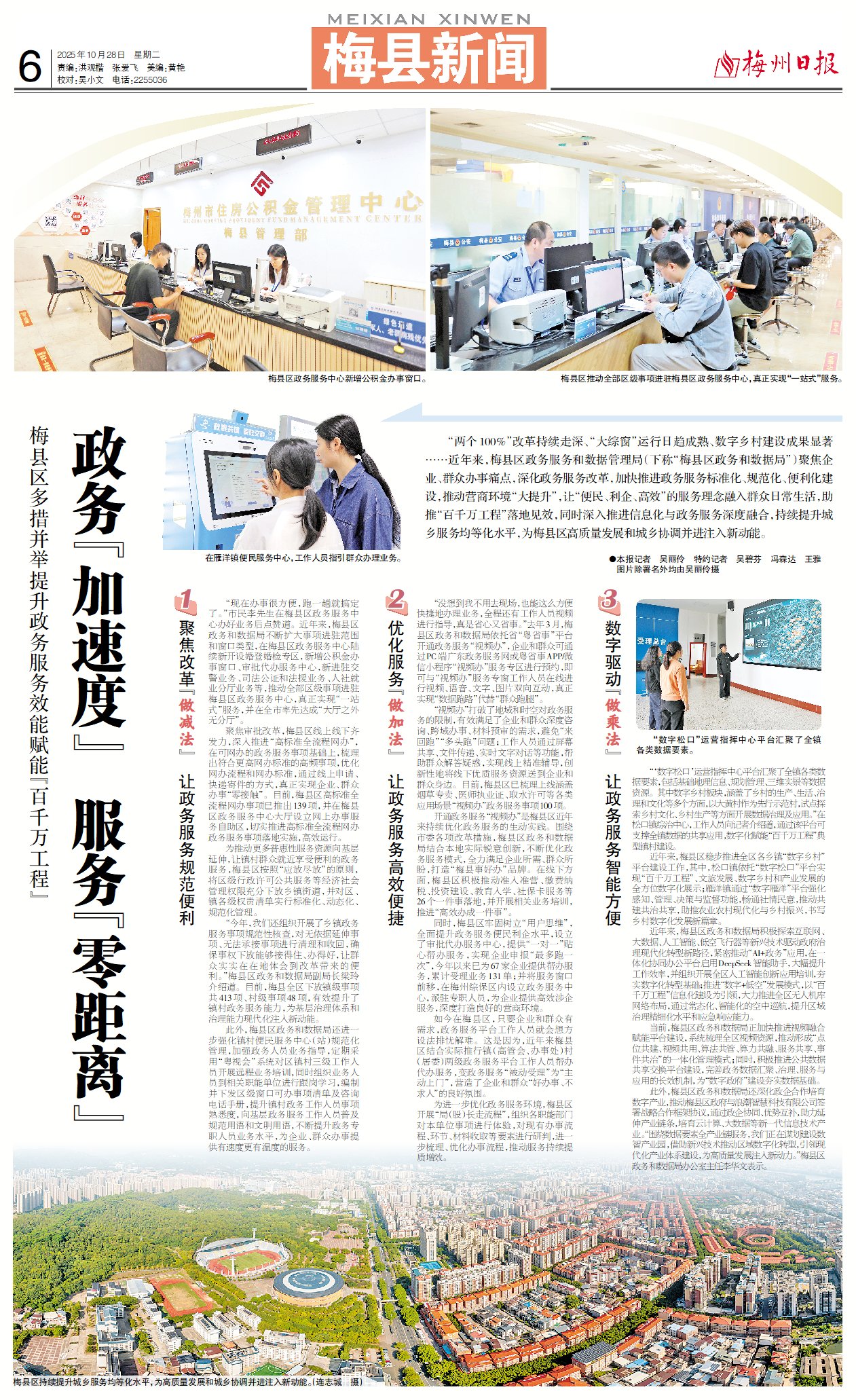 “两个100%”改革持续走深、“大综窗”运行日趋成熟、数字乡村建设成果显著……近年来,梅县区政务服务和数据管理局(下称“梅县区政务和数据局”)聚焦企业、群众办事痛点,深化政务服务改革,加快推进政务服务标准化、规范化、便利化建设,推动营商环境“大提升”,让“便民、利企、高效”的服务理念融入群众日常生活,助推“百千万工程”落地见效,同时深入推进信息化与政务服务深度融合,持续提升城乡服务均等化水平,为梅县区高质量发展和城乡协调并进注入新动能。