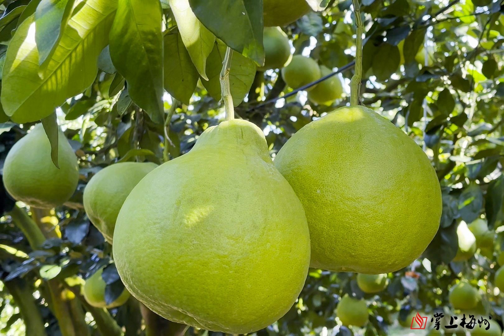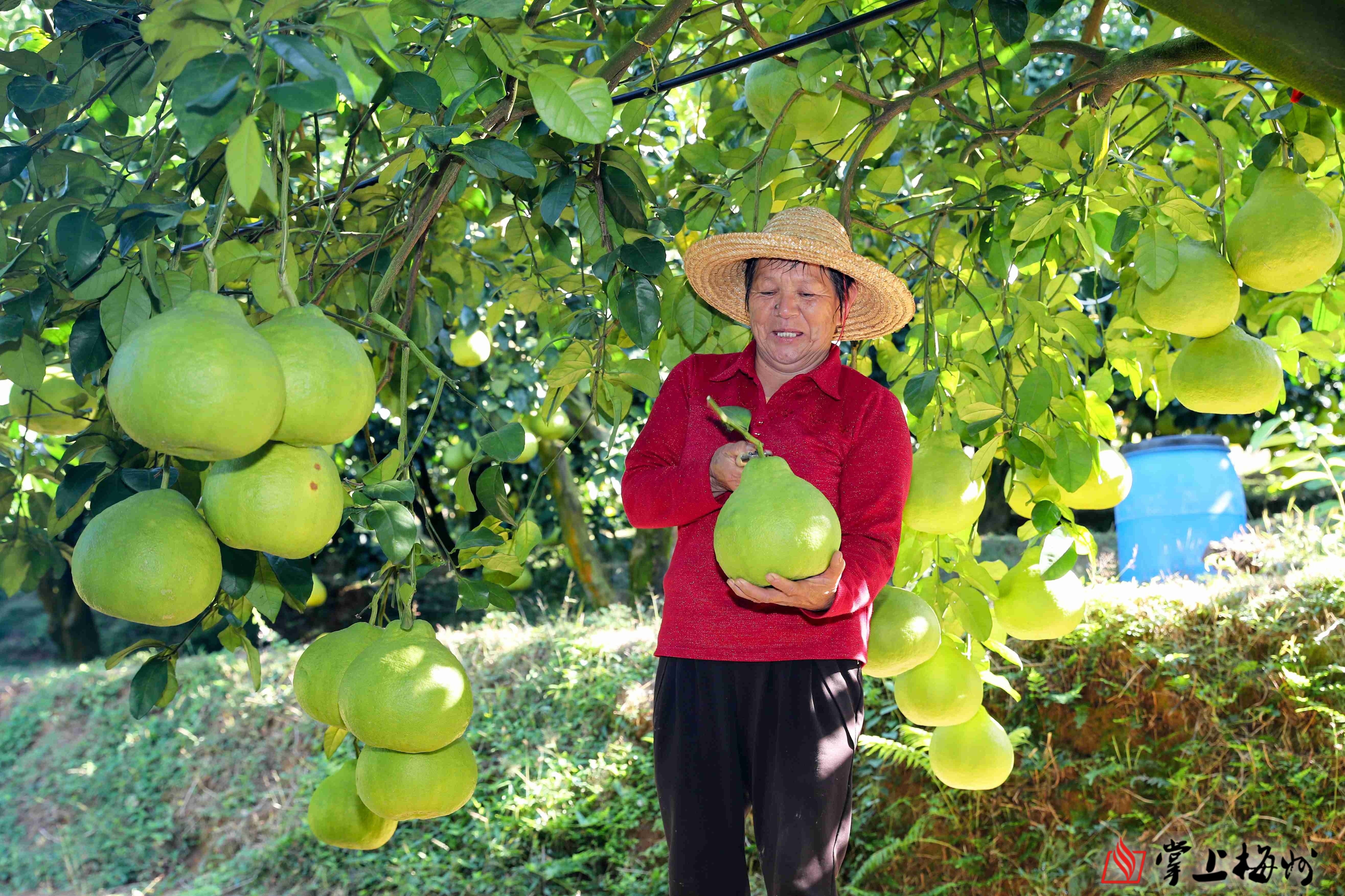 在雁洋镇四和村的柚园里饱满的金柚挂满枝头,采摘金柚的柚农脸上洋溢着丰收的喜悦。
