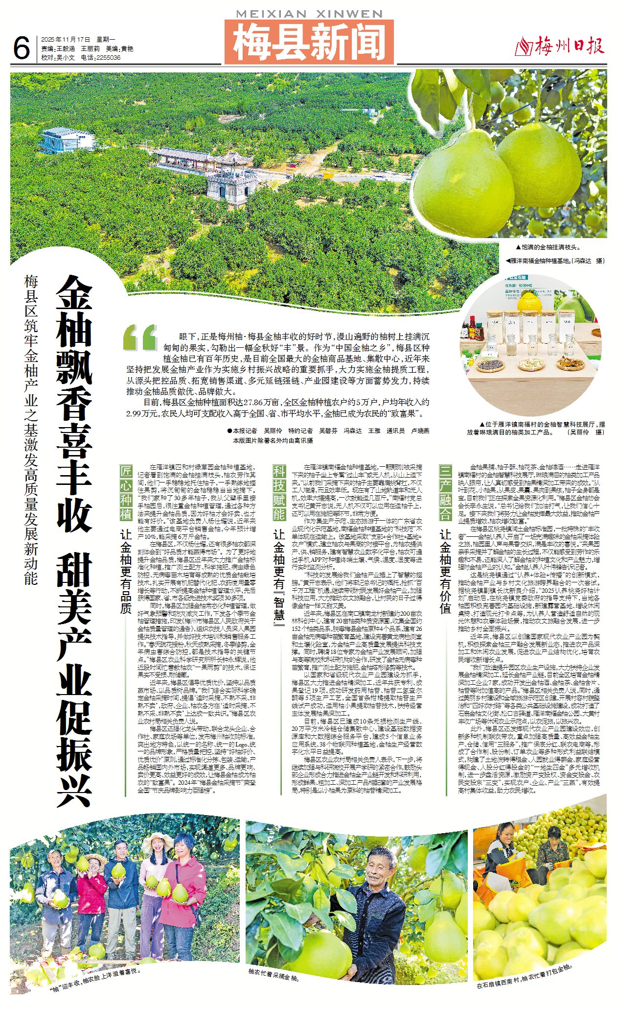 金柚果脯、柚子酥、柚花茶、金柚啤酒……走进雁洋镇南福村的金柚智慧科技展厅,琳琅满目的柚类加工产品映入眼帘,让人真切感受到柚果精深加工带来的成效。“从叶到花、小柚果,从果皮、果囊、果肉到果核,柚子全身都是宝,目前我们正在探索全果资源化利用。”梅县区金柚协会会长李永生说,“总书记给我们加油打气,让我们信心十足。接下来我们将努力让金柚发挥最大效益,推动金柚产业提质增效、柚农增收致富。”