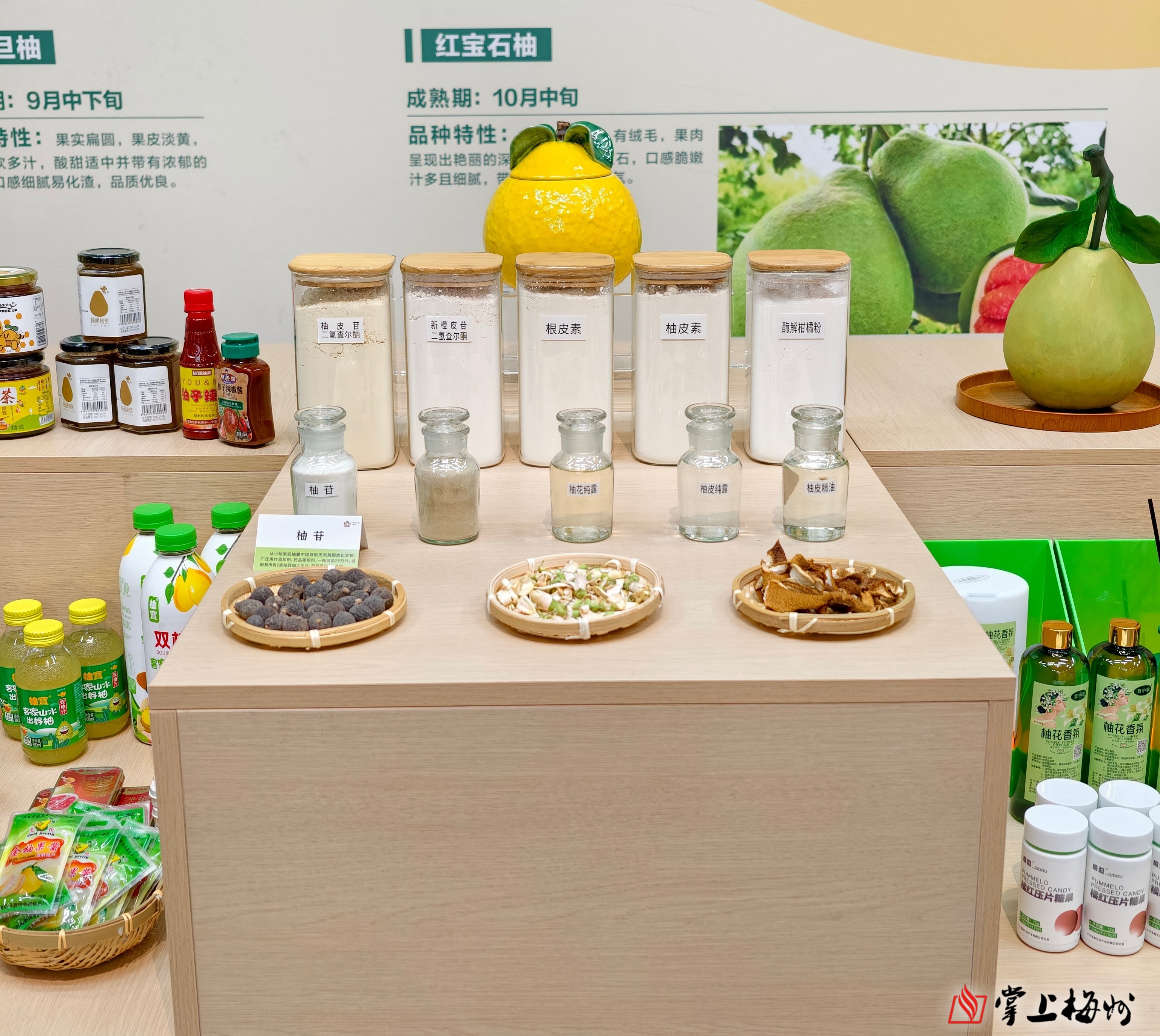 位于雁洋镇南福村的金柚智慧科技展厅,摆放着琳琅满目的柚类加工产品。(吴丽伶 摄)