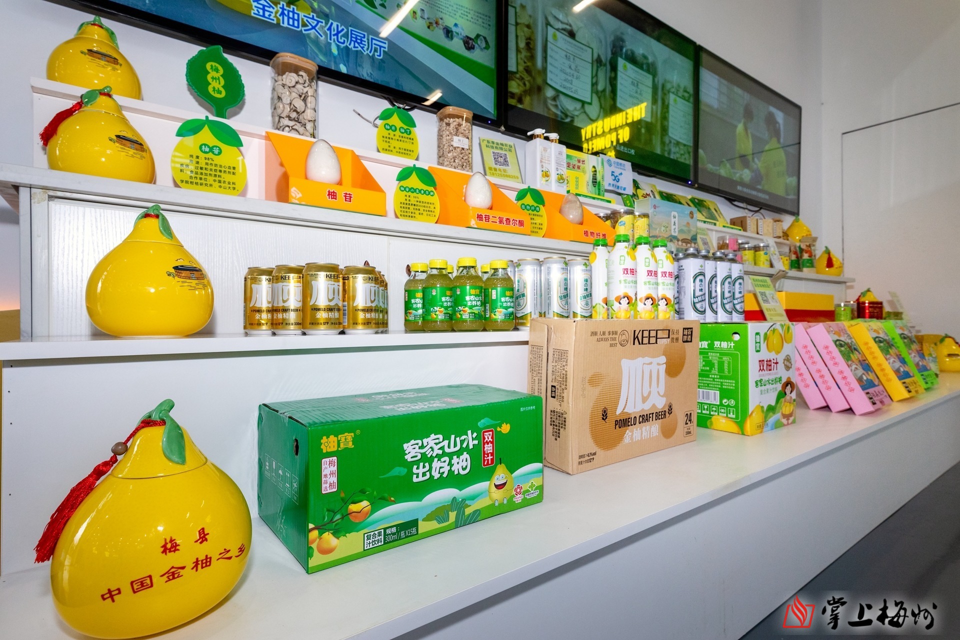位于雁洋镇南福村的金柚智慧科技展厅,摆放着琳琅满目的柚类加工产品。(连志城 摄)