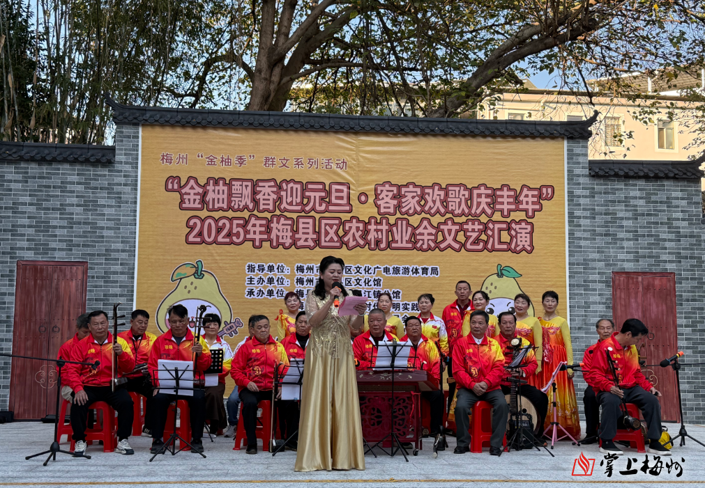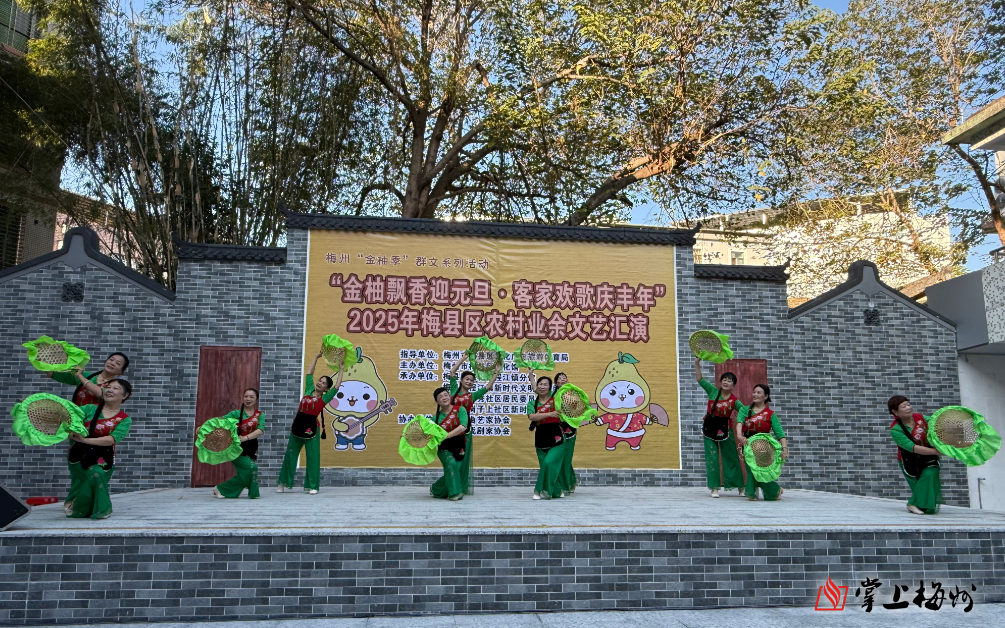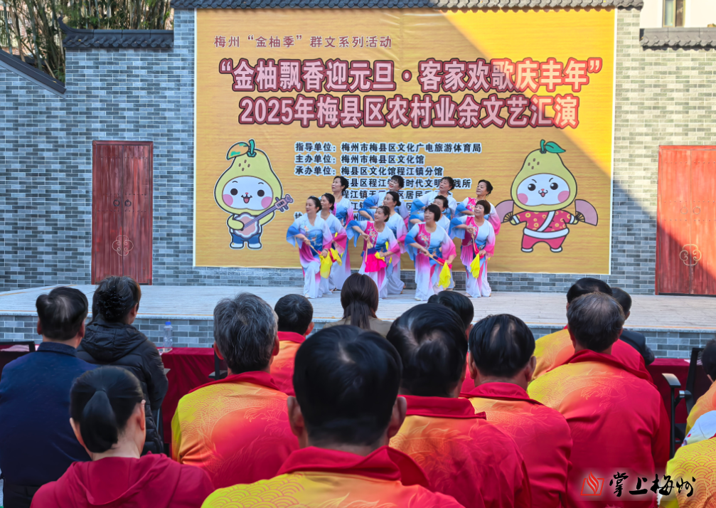 掌上梅州讯 2026年元旦即将到来,2025年12月29日下午,梅州“金柚季”群文系列活动之“金柚飘香迎元旦·客家欢歌庆丰年”2025年梅县区农村业余文艺汇演在梅县区程江镇文化活动中心精彩上演。来自全区的文艺队伍齐聚一堂,用歌声唱响丰收喜悦,以舞姿描绘幸福生活,为现场观众献上了一场充满乡土气息与客家风情的文化盛宴。