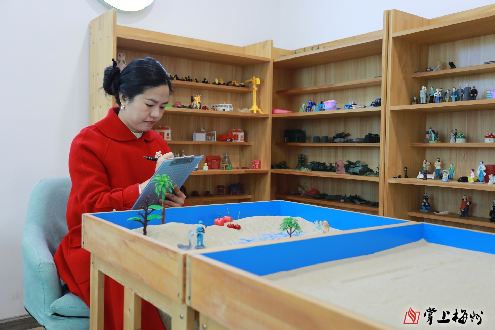 在梅县区12355青少年服务中心沙盘室,心理咨询师进行复盘,进一步了解来访青少年的内心世界。(吴丽伶 摄)