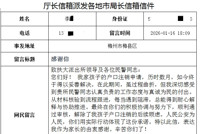 起初,李女士对办理注销户口需耗时较长感到不理解,曾通过“平安厅”信箱渠道反映诉求。接到信件转办后,梅县公安高度重视,户籍民警第一时间与李女士取得联系,民警通过清晰、透明的讲解,逐步化解了李女士心中的疑虑和担忧。此后,梅县公安户政部门加紧了内部流程推进与外部协调核查的步伐,在严格遵守各项规章制度、确保户籍登记准确无误的前提下,尽可能压缩各个环节的办理时间。他们多次主动联系李女士,告知进展情况,提醒需要补充的材料,确保流程顺畅。