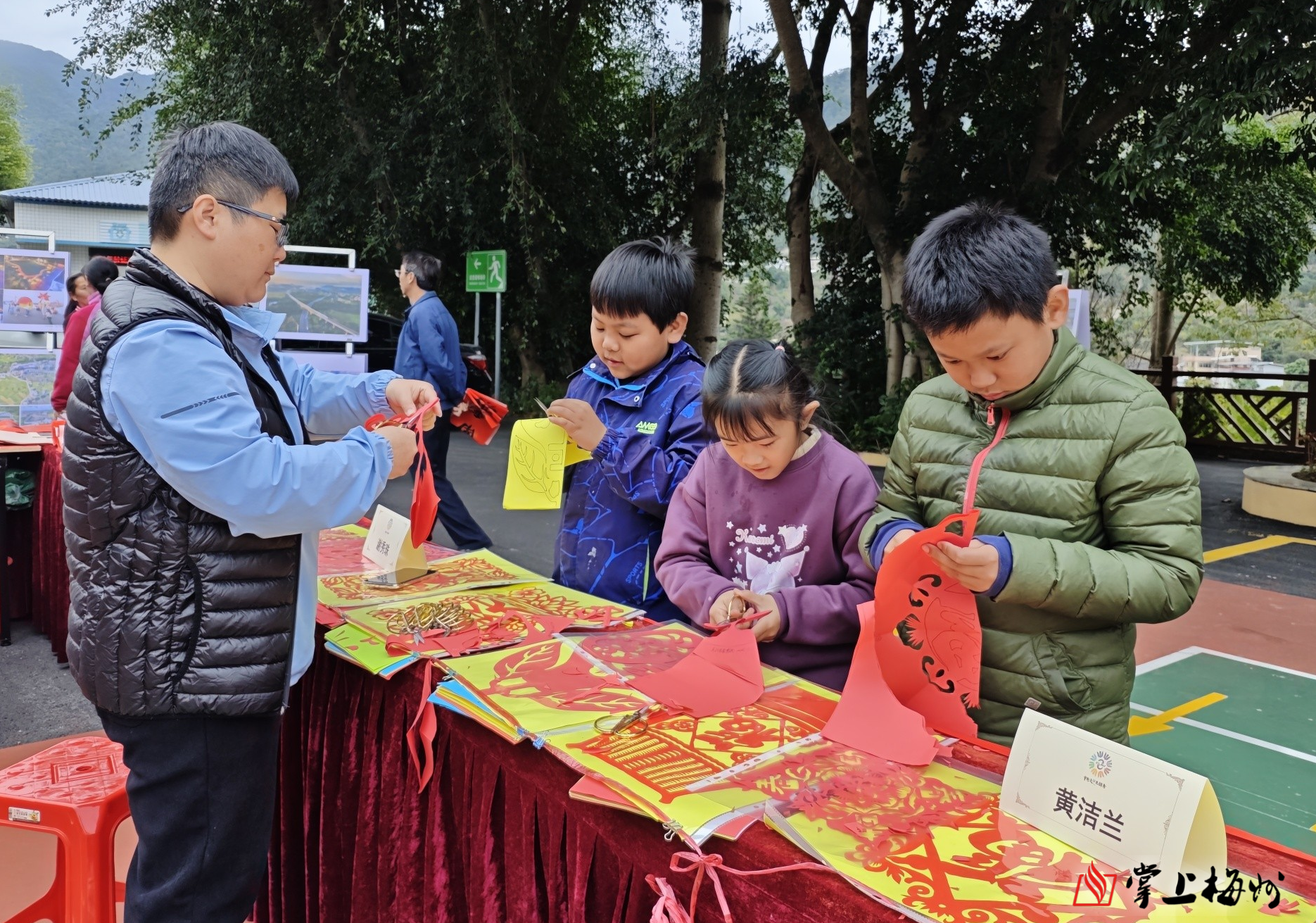 “万福迎春——春到南福·挥春送福”惠民活动同步举行。在文艺创作区,15名书法家挥毫泼墨,大红的春联与“福”字,流转着端庄楷书、飘逸行草,笔墨间寄托着安康团圆、丰收兴旺的美好祝愿。梅州画院组织21名美术志愿者现场创作,有色彩明快的传统年画、优雅端庄的国画团扇,也有韵味质朴的兴宁版画、非遗拓印,绽放繁花吉语的客家剪纸、憨态可掬的南福金柚造型泥塑等民俗艺术品。一件件作品匠心独具、年味浓郁。村民们有序领取春联、“福”字及手工艺品,笑容满面。