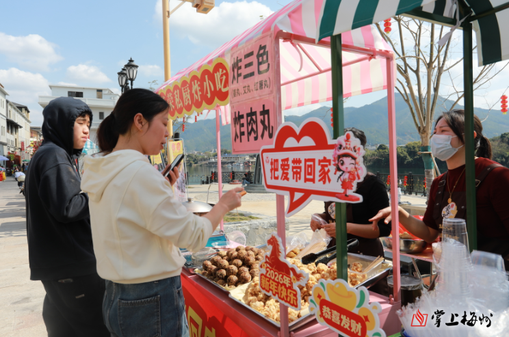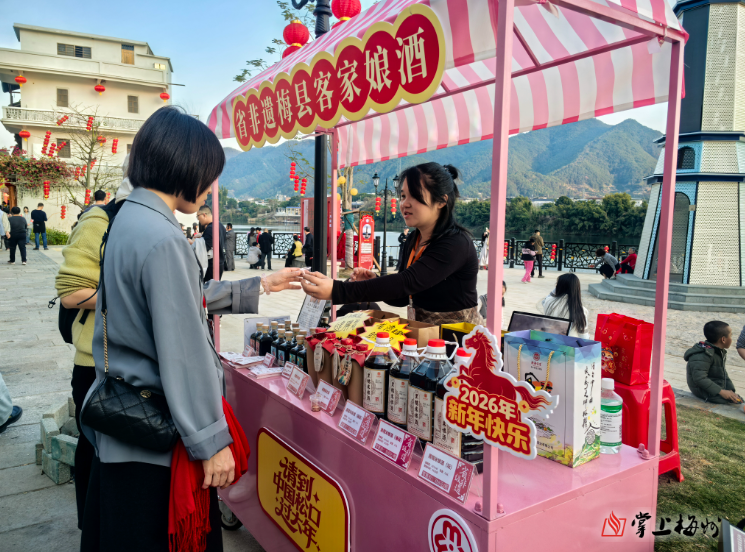 活动现场,展位上摆满了梅州金柚、松口炸肉丸、客家娘酒、白渡牛肉干、仙人粄等梅州特色产品琳琅满目,方寸之间尽显地方风韵,女企业家与创业能手们化身“推荐官”,以热情讲解吸引众多嘉宾与游客驻足,现场选购氛围热烈。“过年回乡逛松口古街,正巧赶上这场展销会,买些炸肉丸和萝卜粄给孩子们尝尝,年味十足!”返乡过年的梁女士提着刚选购的特产,脸上洋溢着满足的笑容。