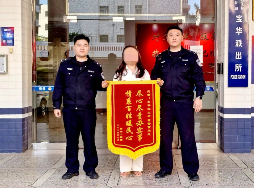 近日,市民梁女士专程来到梅州市公安局梅县分局宝华派出所,将一面印有“尽心尽责办实事 情系百姓暖民心”的锦旗送到办案民警手中,感谢公安机关快速破案,为其追回被盗项链。