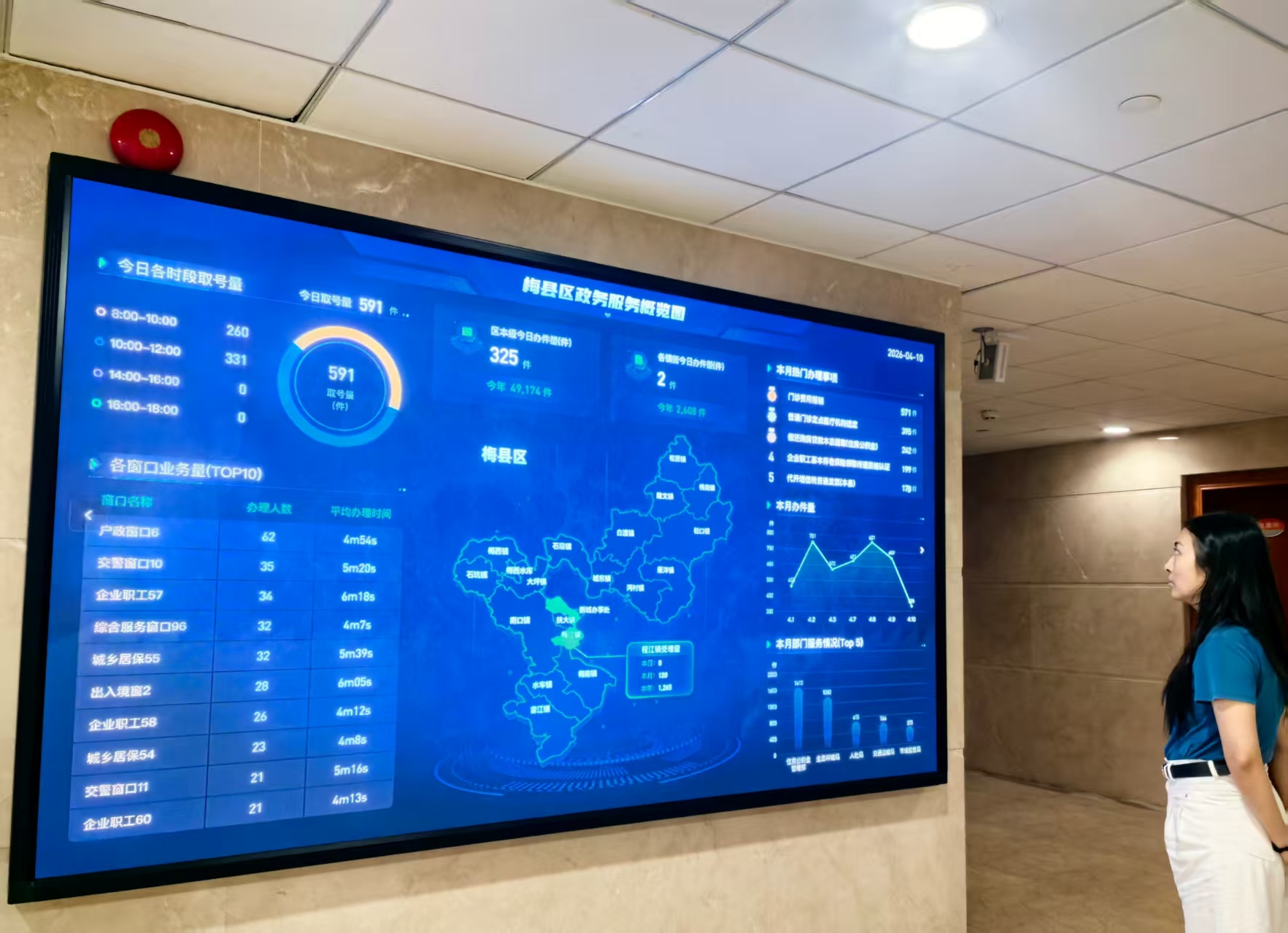 在梅县区政务服务中心4楼,一块数据可视化大屏实时跳动着各类政务数据,屏幕上各部门办件量、办件效率、高频办事事项等核心指标一目了然,直观呈现出全区政务服务的整体运行态势。“通过大屏,我们能实时掌握哪个窗口业务繁忙、哪个事项办理耗时较长,从而及时调配人员、优化流程。”梁玲说。