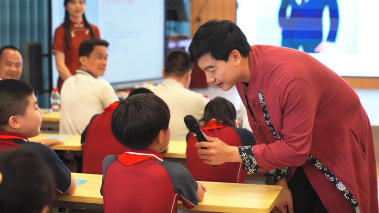 在山歌互动教学环节,两位传承人采用逐句领唱、分段精讲、节奏带练的方式,从咬字、腔调到韵律,手把手带领学生们学唱。从轻声跟唱到整齐合唱,从分组对唱到学生主动上台单独展示,学生们在传唱中熟记国安知识,在韵律中厚植家国情怀。