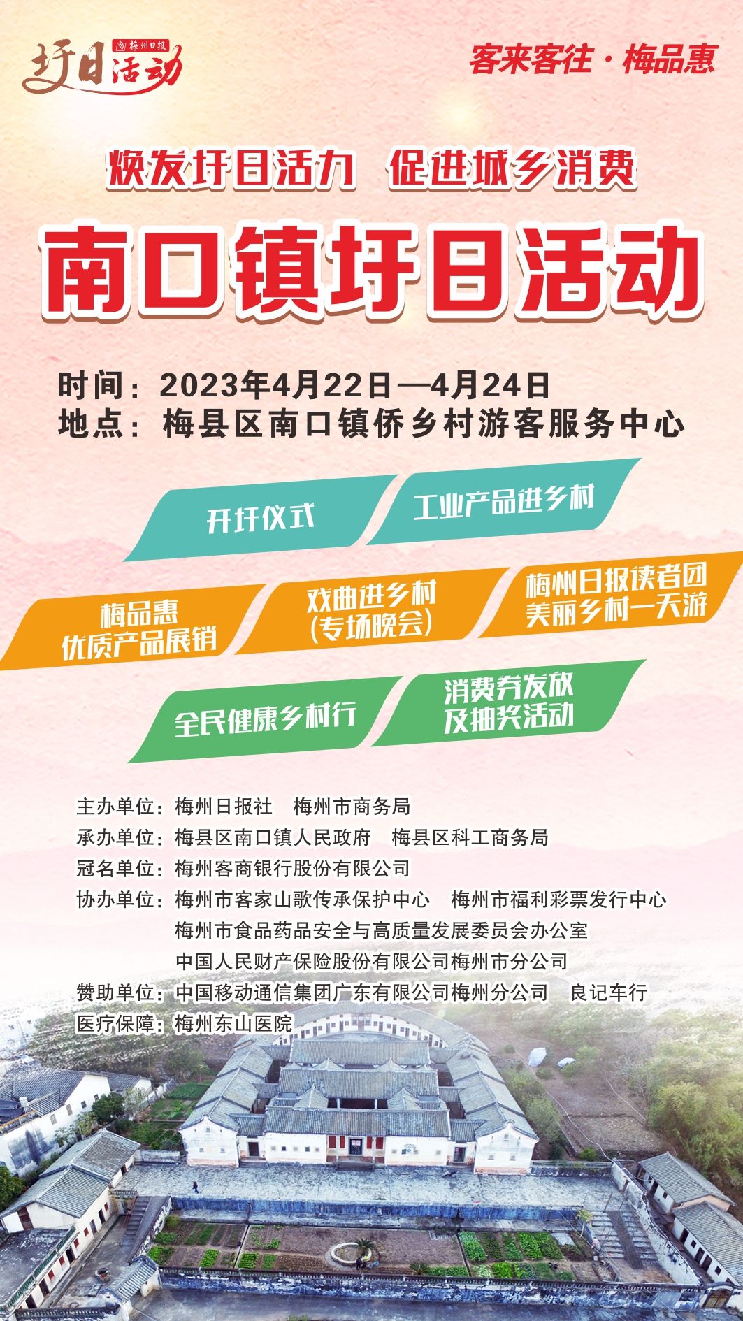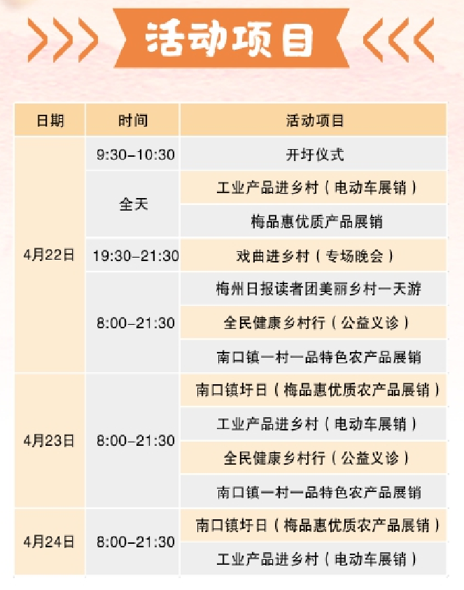 体验独具特色的开圩仪式、逛“梅品惠”优质产品展销、与梅州日报读者团美丽乡村一天游、参加戏曲进乡村专场晚会等一系列活动强势来袭,快随小编一同提前赴圩吧!