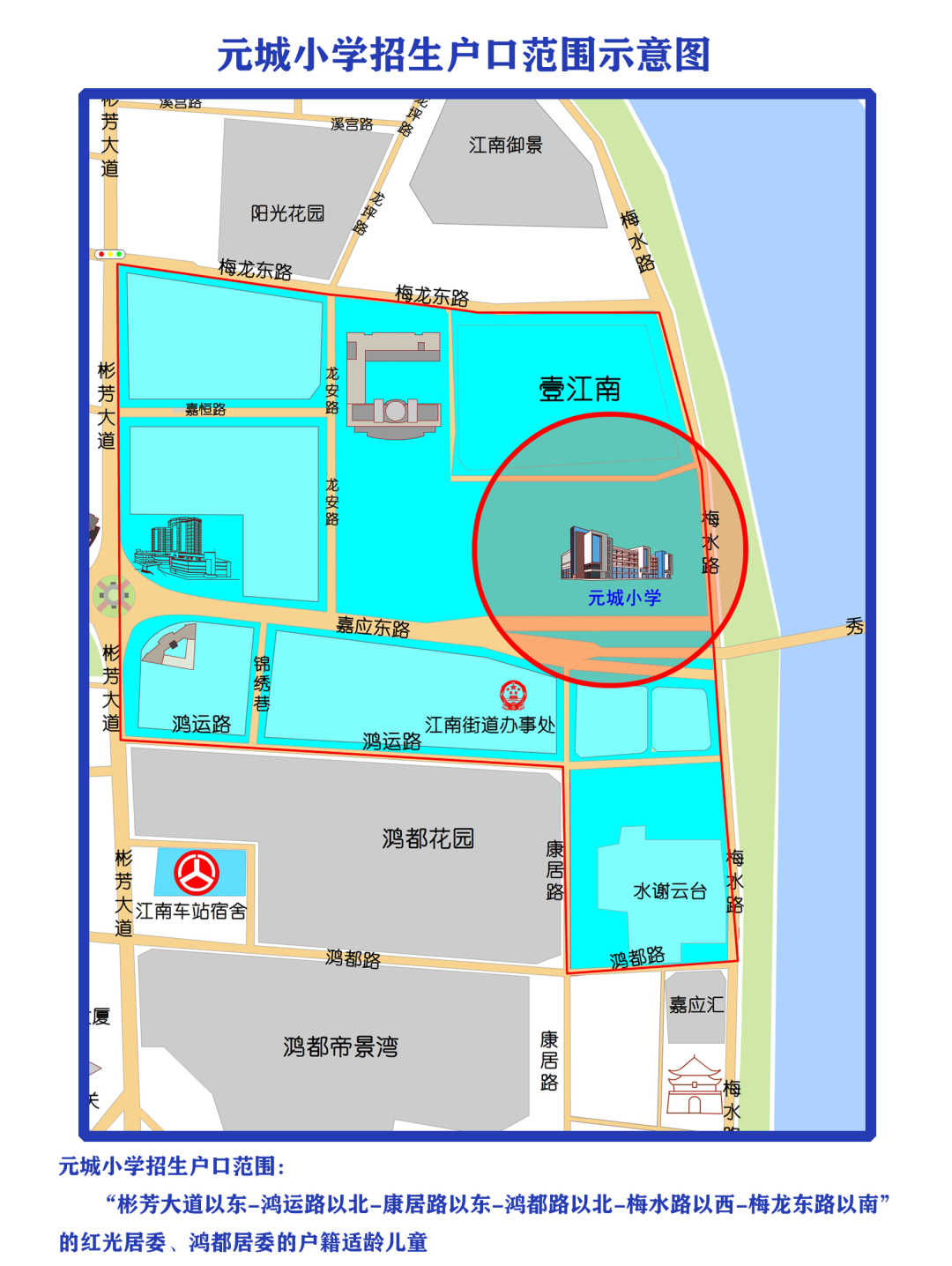 “彬芳大道以东-鸿运路以北-康居路以东-鸿都路以北-梅水路以西-梅龙东路以南”的红光居委、鸿都居委的户籍适龄儿童。