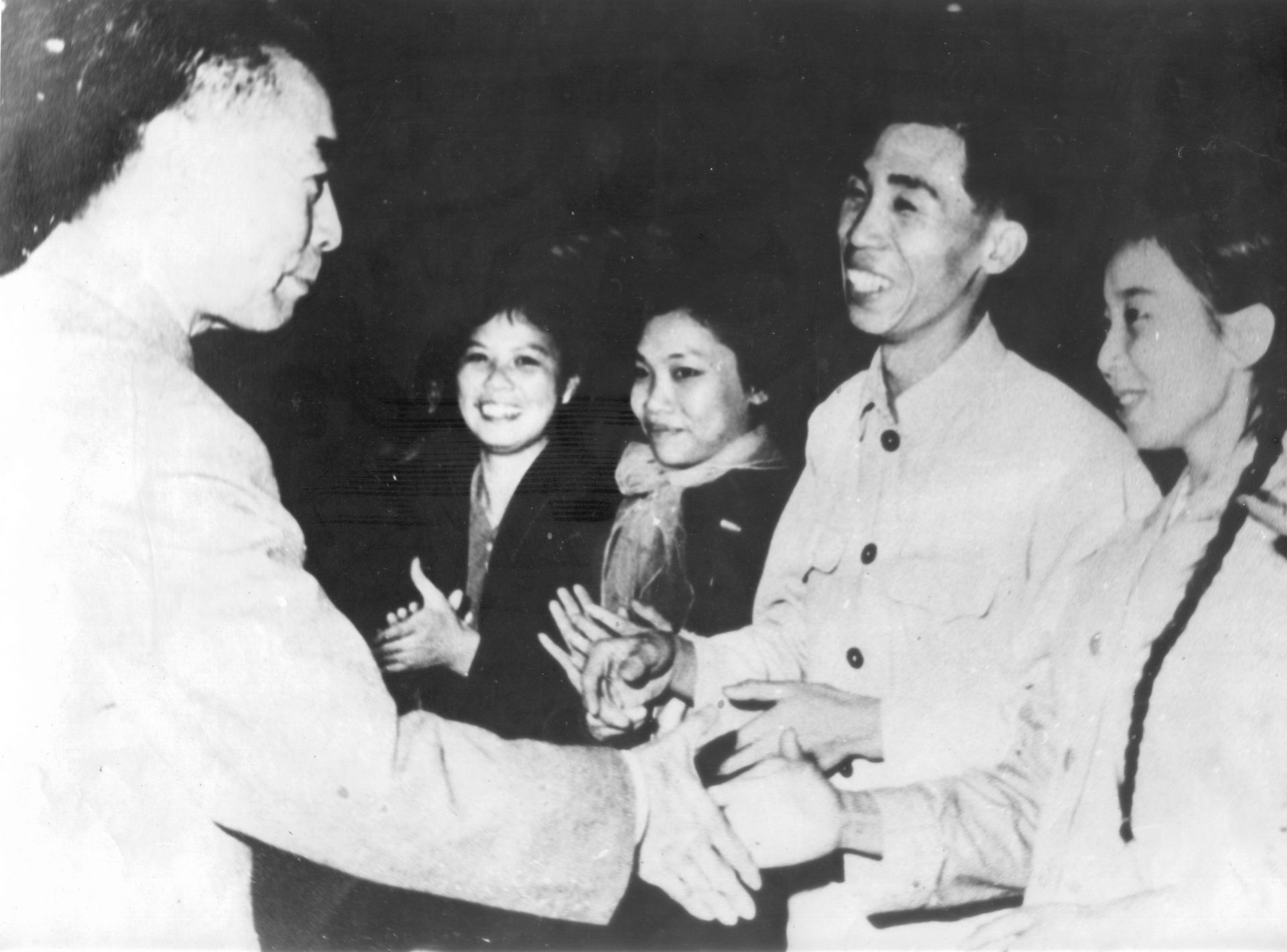 △1964年周总理在广州接见山歌剧名演员张振坤、蓝小田等。拍摄者不详。