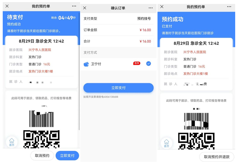 5、预约成功后,点击“立即支付”完成线上支付,支付成功后按照预约时间前往医院就诊即可。