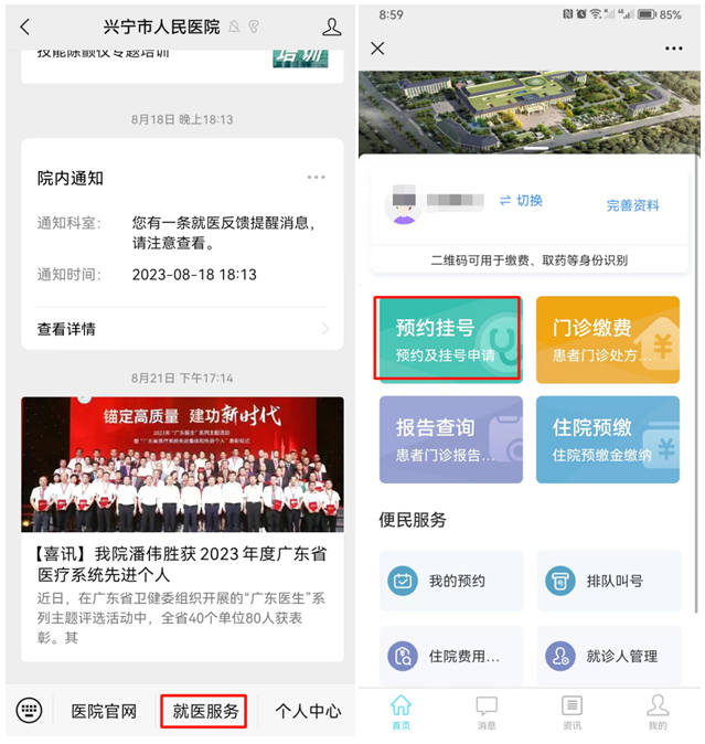 今后,您只需通过“兴宁市人民医院”微信公众号,选择“就医服务”进入首页,选择相关服务就好。