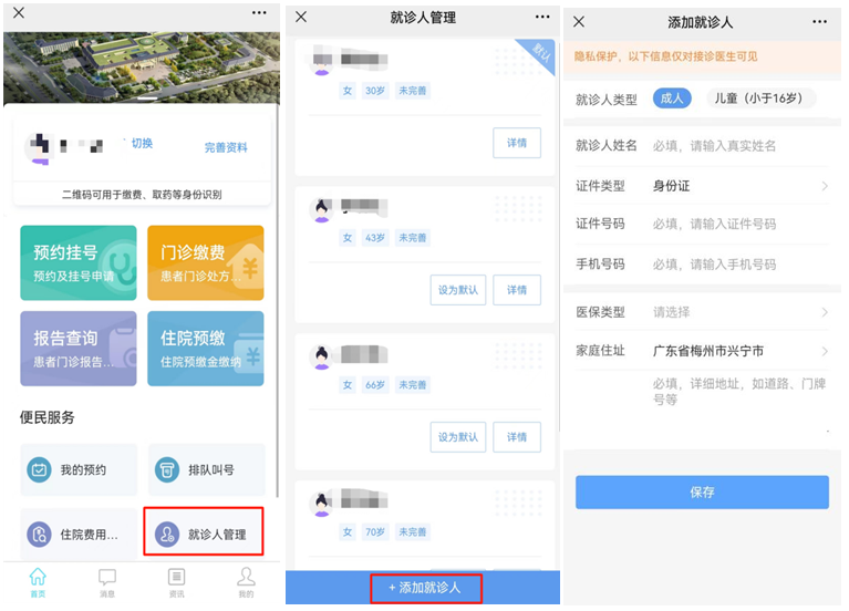 操作步骤:首页页面点击“就诊人管理”→“添加就诊人”→选择就诊人类型→填写就诊人信息保存,即添加成功