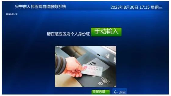 第3步,显示下面的图,就将身份证放入自助机指定位置(也可以点击屏幕的手动输入)