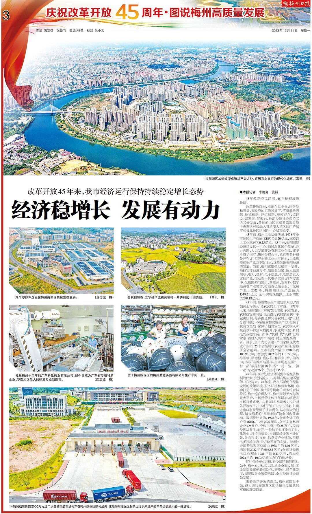 掌上梅州讯 45载风雷激荡,45载波澜壮阔。今年是改革开放45周年和党的十八届三中全会召开10周年。为营造良好的庆祝氛围,展现梅州人民开拓进取、敢为人先的精神风貌,本报抽调骨干人员,组建全媒体采访团队深入一线,以“改革开放的见证者、改革开放的参与者”双重视角,聚焦改革开放45年来梅州在经济、政治、文化、社会、生态文明建设等方面取得的可喜成绩,围绕经济发展、社会事业、百姓生活、城乡面貌、踔厉奋发、守正创新等六个主题,陆续推出“庆祝改革开放45周年·图说梅州高质量发展”系列报道,全方位立体式展现梅州勇于先行先试、推动高质量发展的成效和经验。今日推出“经济发展”主题特别报道,敬请垂注。(记者张爱飞)