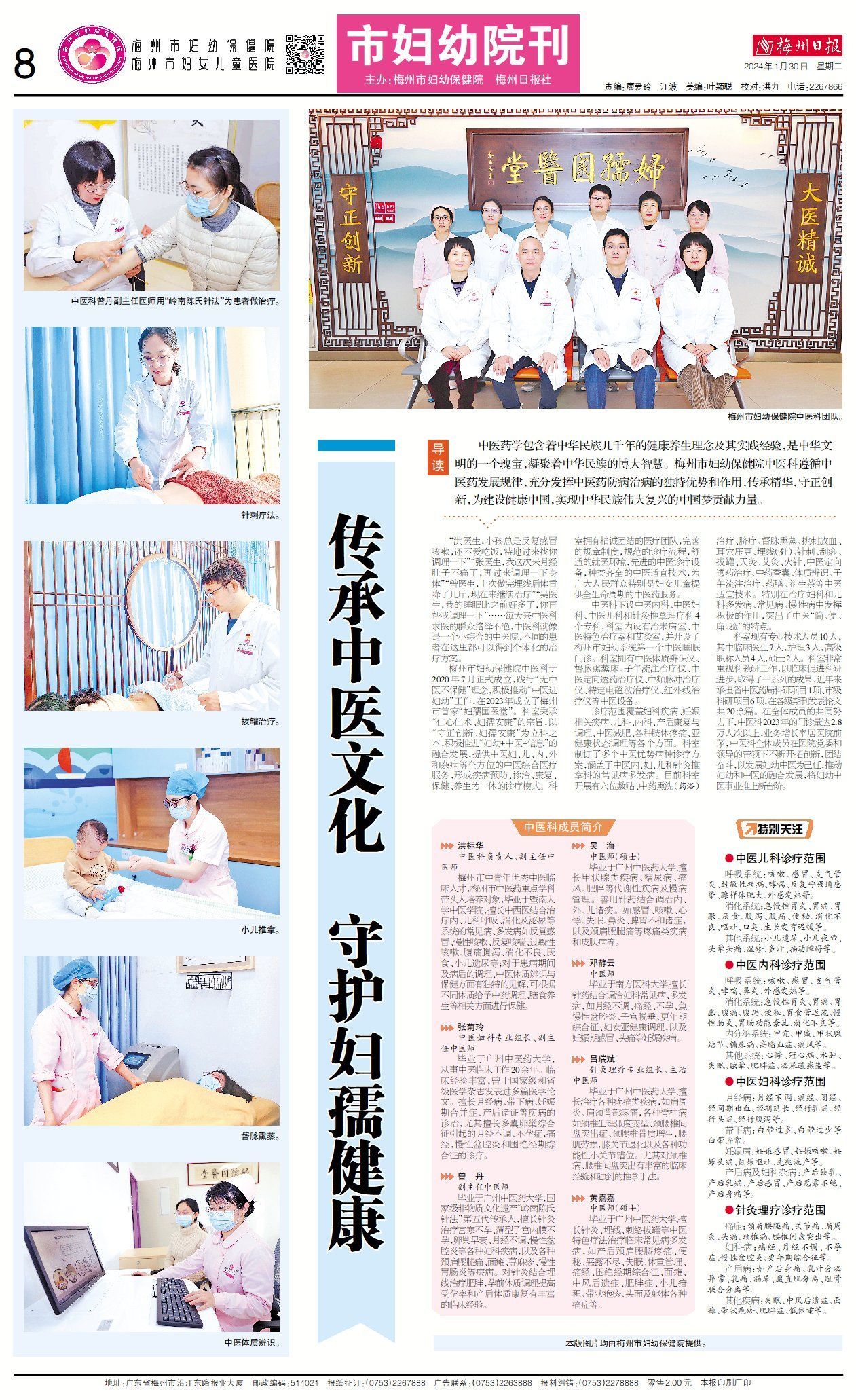 梅州市妇幼保健院中医科于2020年7月正式成立,践行“无中医不保健”理念,积极推动“中医进妇幼”工作,在2023年成立了梅州市首家“妇孺国医堂”。科室秉承“仁心仁术、妇孺安康”的宗旨,以“守正创新、妇孺安康”为立科之本,积极推进“妇幼+中医+信息”的融合发展,提供中医妇、儿、内、外和杂病等全方位的中医综合医疗服务,形成疾病预防、诊治、康复、保健、养生为一体的诊疗模式。科室拥有精诚团结的医疗团队,完善的规章制度,规范的诊疗流程,舒适的就医环境,先进的中医诊疗设备,种类齐全的中医适宜技术,为广大人民群众特别是妇女儿童提供全生命周期的中医药服务。