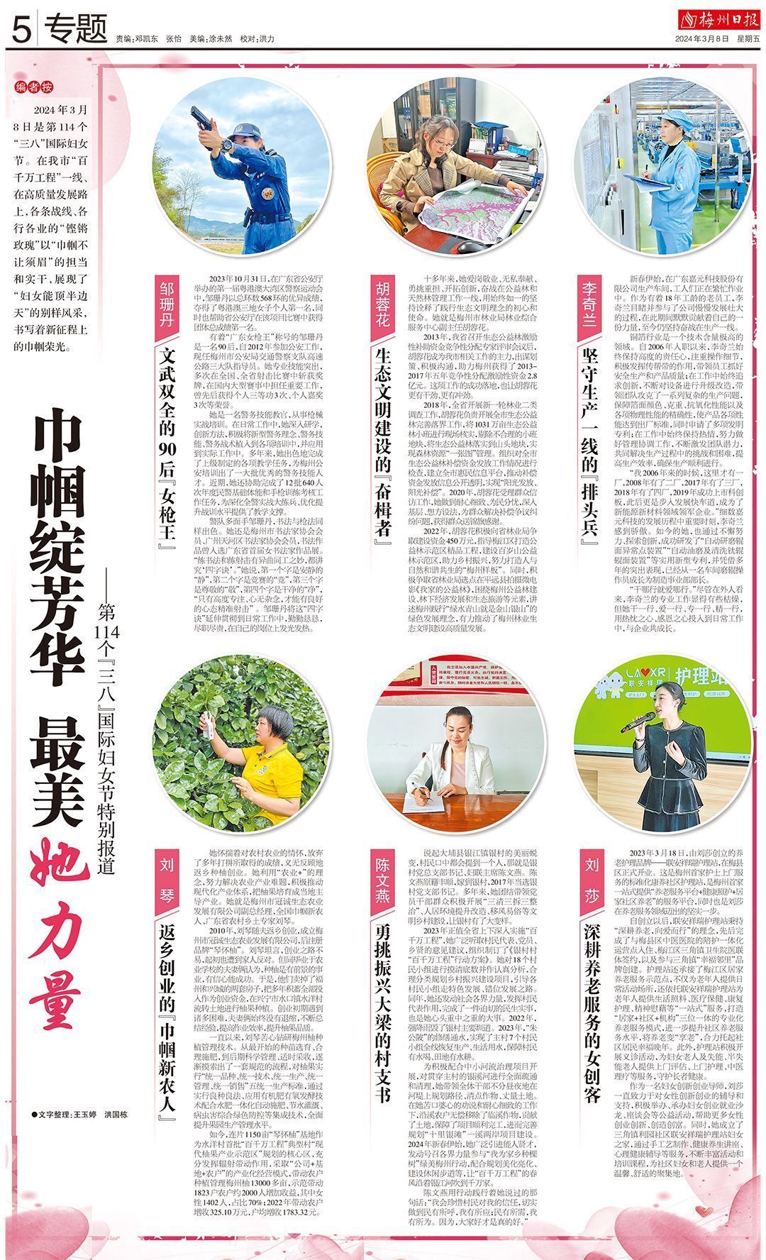 2024年3月8日是第114个“三八”国际妇女节。在我市“百千万工程”一线、在高质量发展路上,各条战线、各行各业的“铿锵玫瑰”以“巾帼不让须眉”的担当和实干,展现了“妇女能顶半边天”的别样风采,书写着新征程上的巾帼荣光。