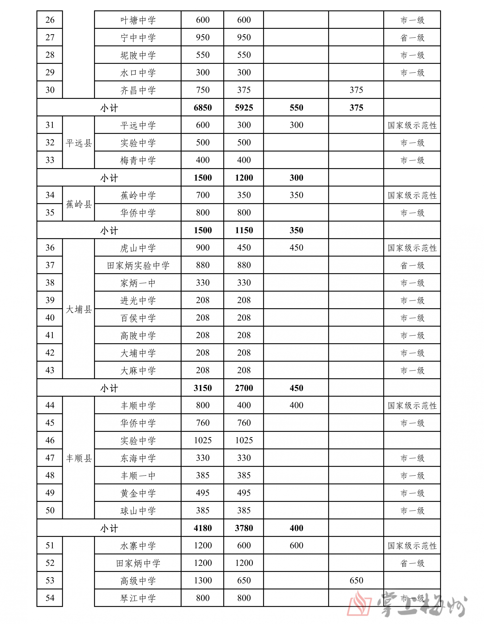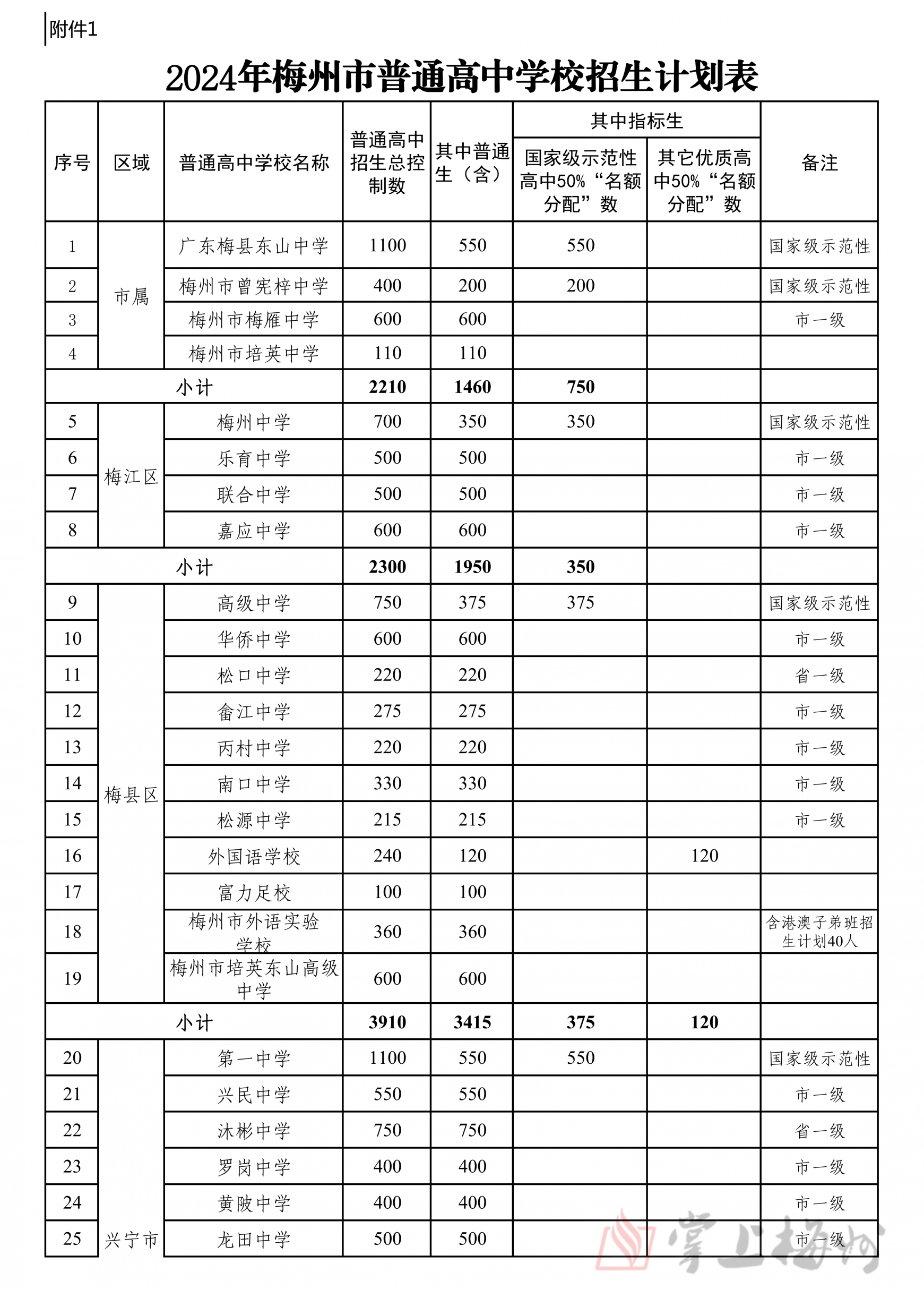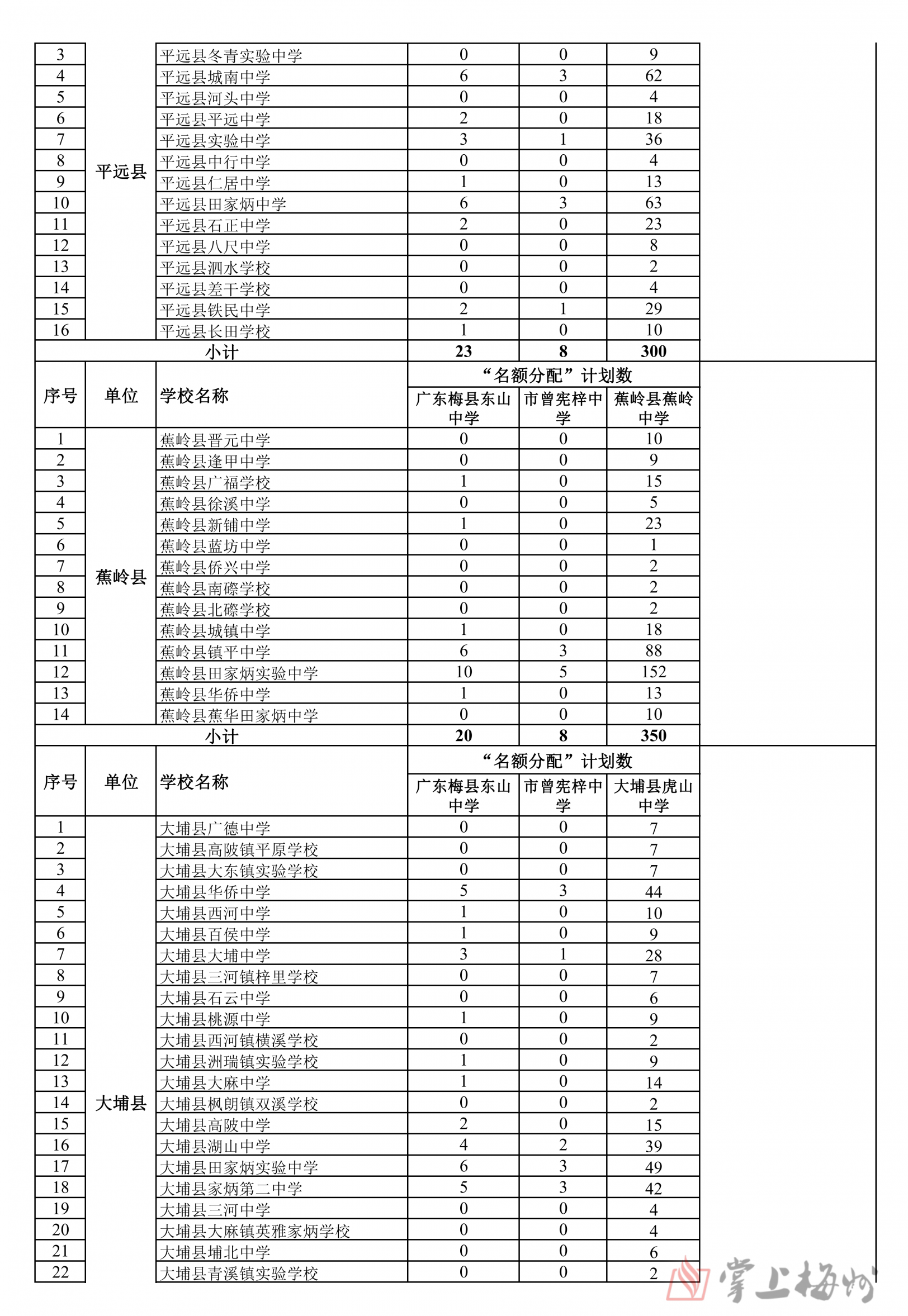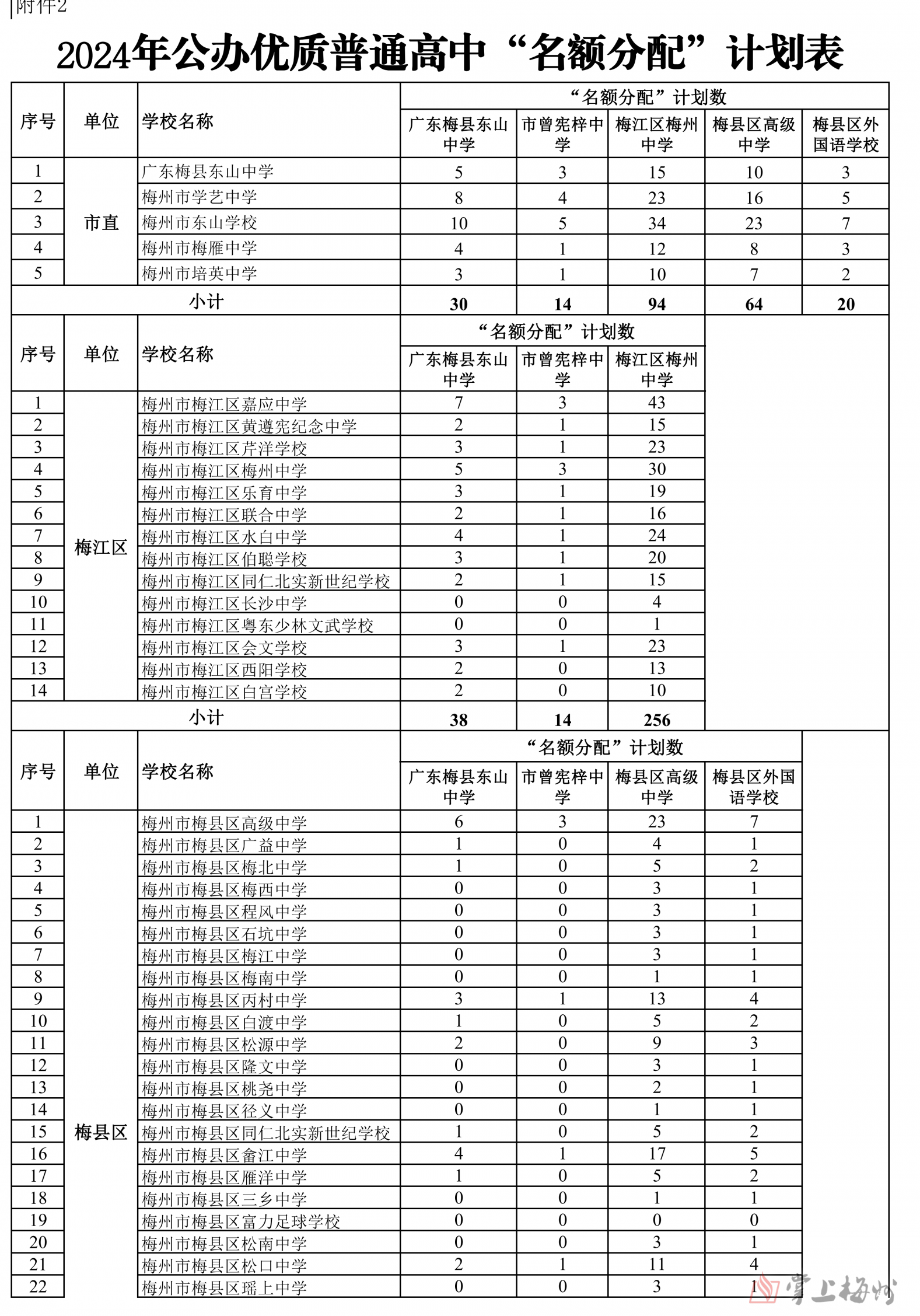 掌上梅州讯 5月16日,市教育局公布梅州2024年普通高中招生计划,经研究,核定2024年全市普通高中学校招生计划35350人,各普通高中学校招生计划和13所公办优质普通高中学校“名额到校”分配情况也同步公布(具体情况可详见下表)。值得注意的是,全市236所初级中学中,因市曾宪梓中学、蕉岭县蕉岭中学、大埔县西岭实验学校、大埔县进光中学、五华县横陂中学2024年无初三毕业生,故未分配“名额到校生”计划。