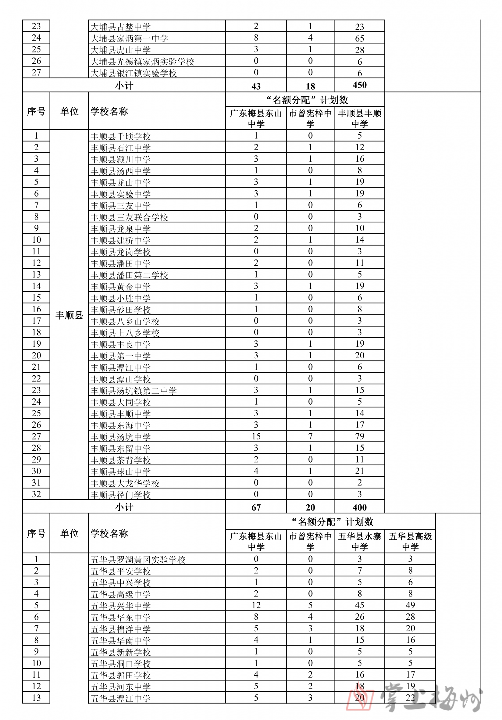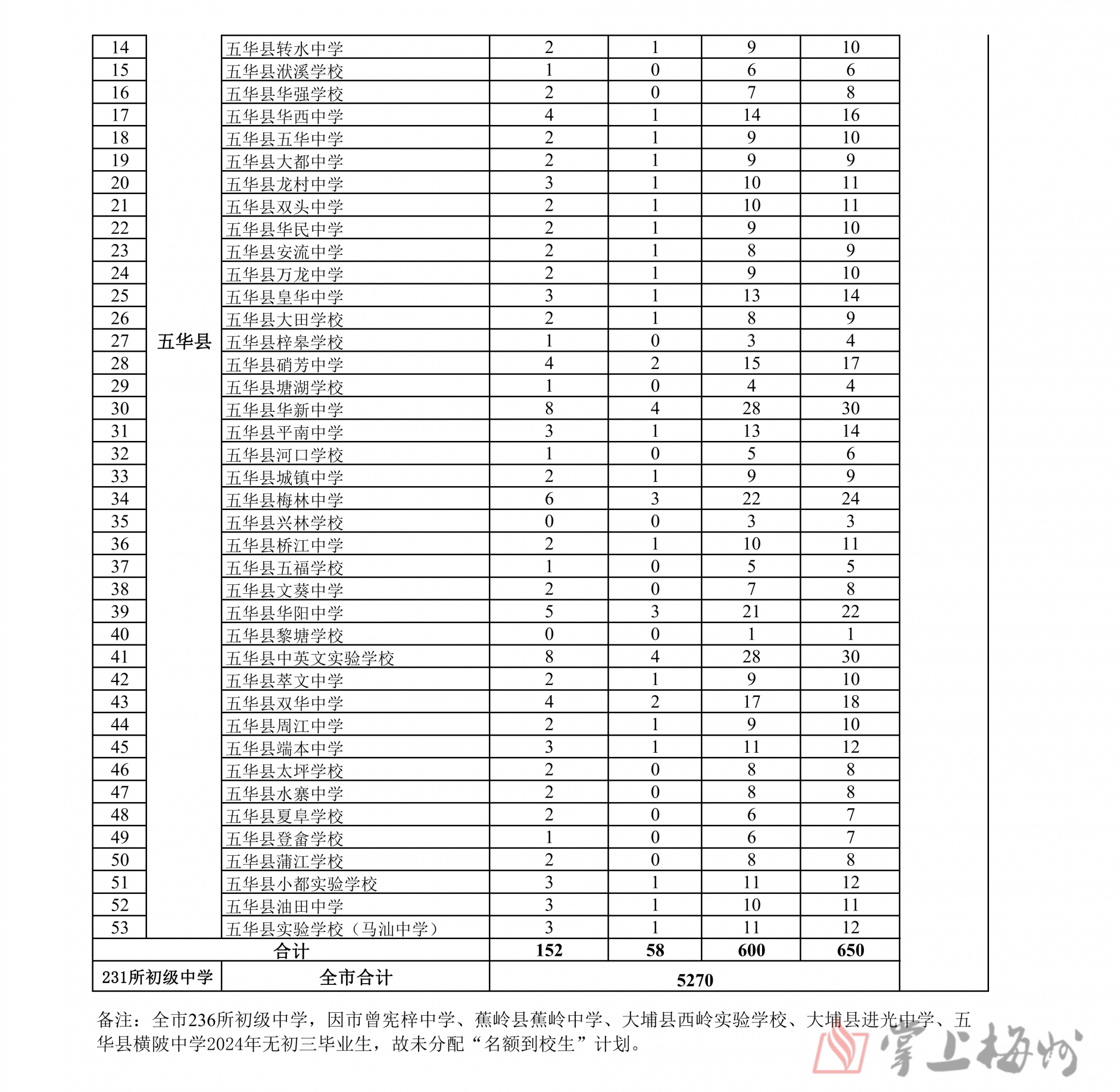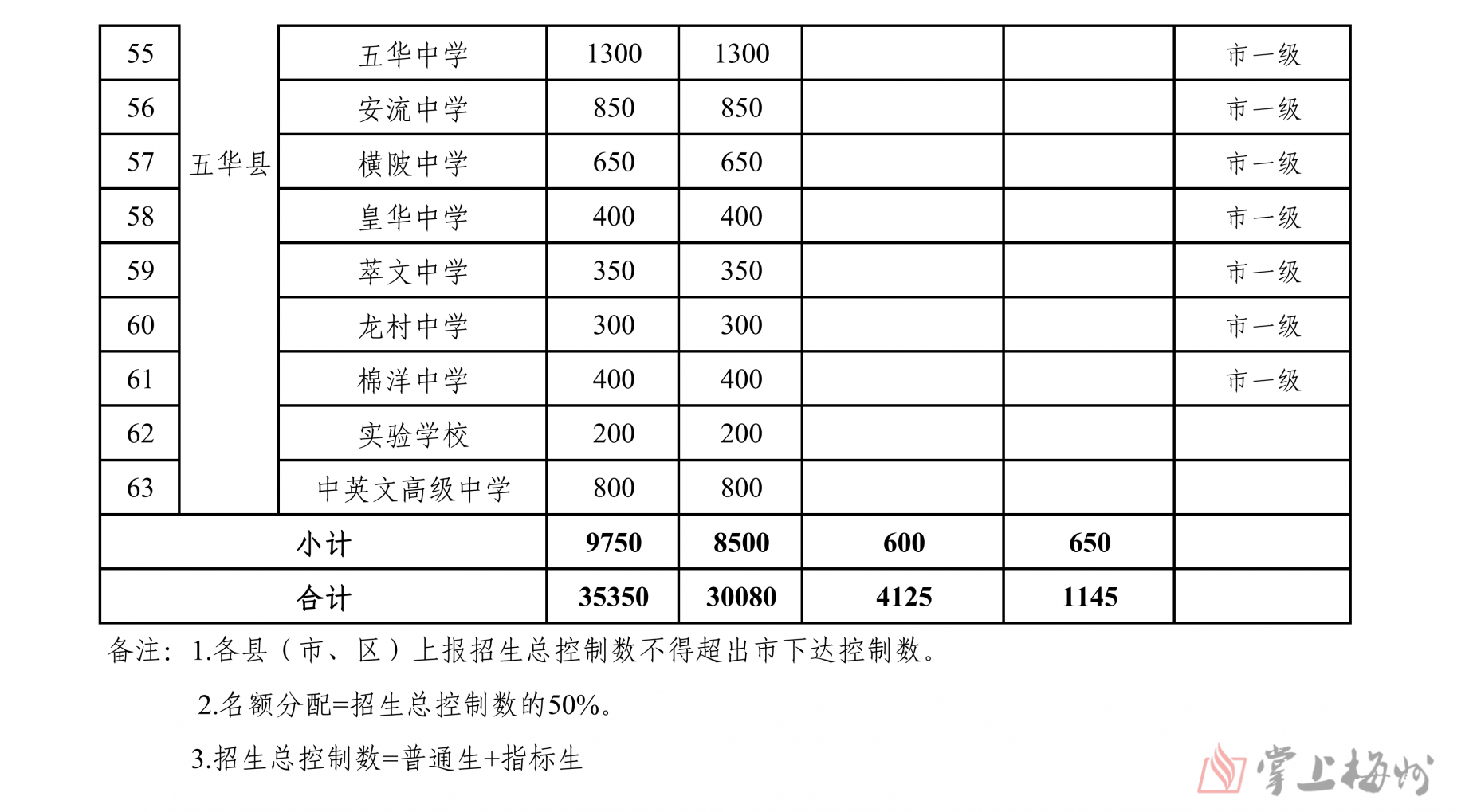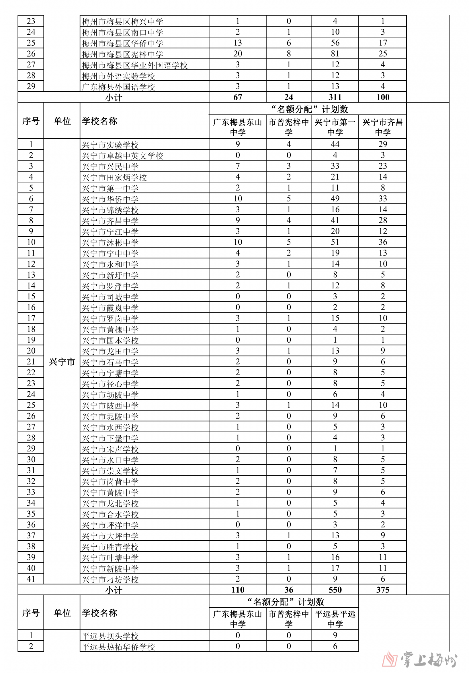 掌上梅州讯 5月16日,市教育局公布梅州2024年普通高中招生计划,经研究,核定2024年全市普通高中学校招生计划35350人,各普通高中学校招生计划和13所公办优质普通高中学校“名额到校”分配情况也同步公布(具体情况可详见下表)。值得注意的是,全市236所初级中学中,因市曾宪梓中学、蕉岭县蕉岭中学、大埔县西岭实验学校、大埔县进光中学、五华县横陂中学2024年无初三毕业生,故未分配“名额到校生”计划。