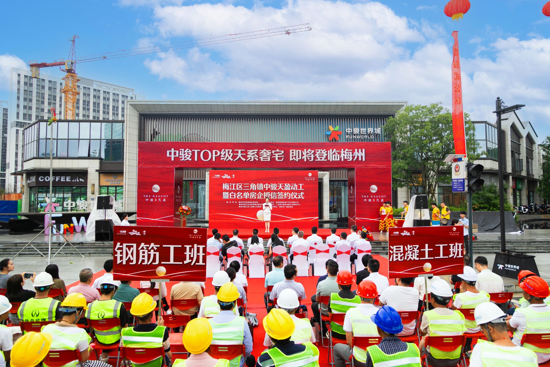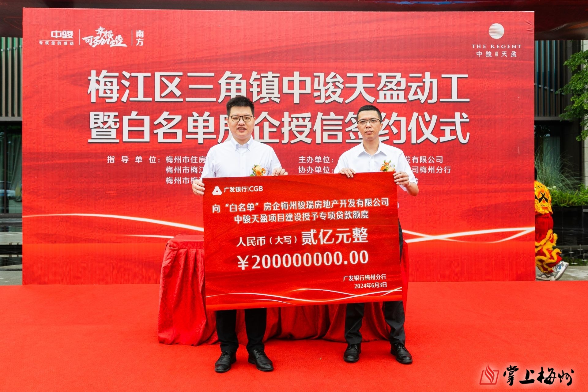 掌上梅州讯 2024年6月3日上午,中骏·梅州天盈项目动工仪式暨房企白名单授信签约仪式在该项目营销中心前广场成功举行。广发银行梅州分行副行长黄文理与中骏·天盈项目总经理王旺忠进行了现场签约,给中骏天盈项目授信2个亿,为该项目有序开发建设注入了强劲动力。