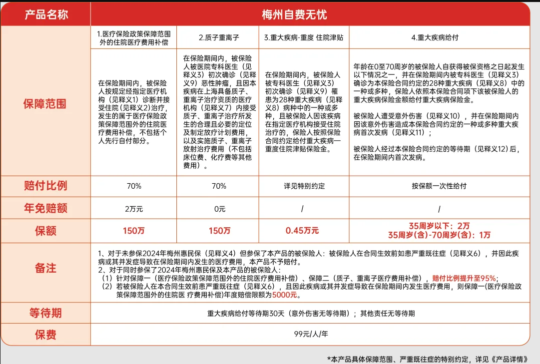 “梅州自费无忧”是一款梅州医保参保人专属补充医疗保险,致力于减轻基本医疗保险政策范围外不能报销的住院自费费用,同时新增重大疾病给付责任,与梅州市基本医疗保险、大病保险、梅州惠民保形成错位补充,合力减轻市民医疗费用负担,避免因病返贫,是梅州市多层次医疗保障体系中重要的一环。