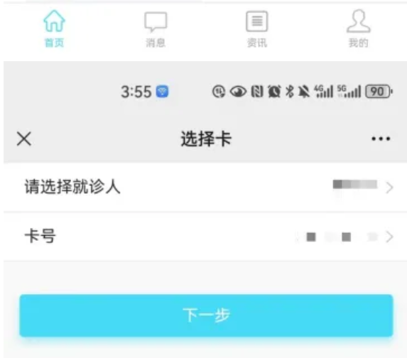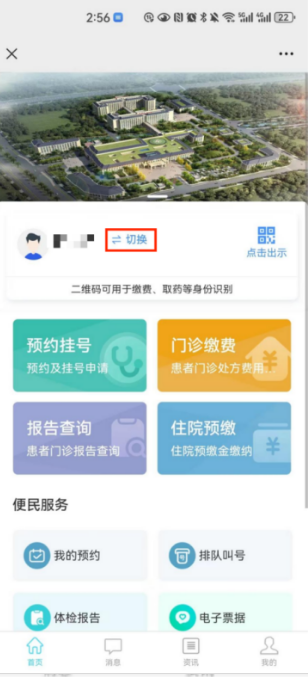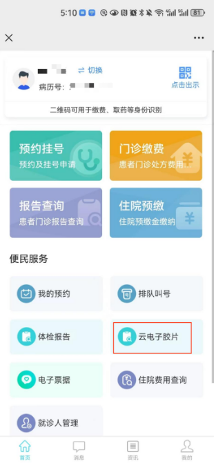 2.点击页面的【切换】按钮,选择对应的就诊人或者是添加就诊人;点击便民服务中的【云电子胶片】按钮,然后选择需要查看的就诊人,点击下一步即可查看云胶片。