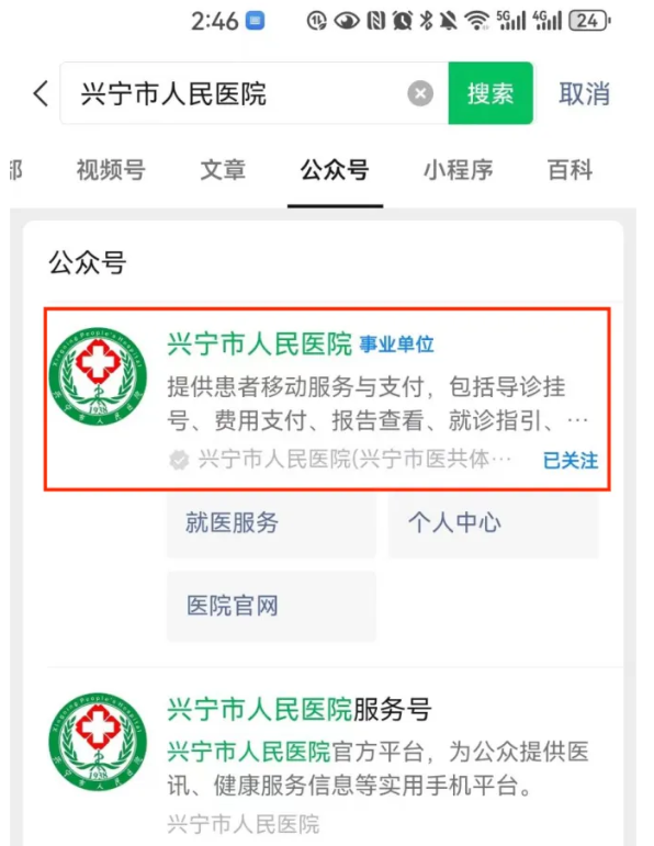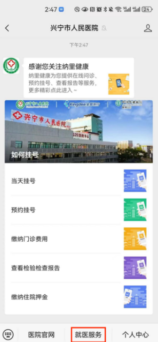 1. 关注【兴宁市人民医院】公众号,进入公众号点击【就医服务】;