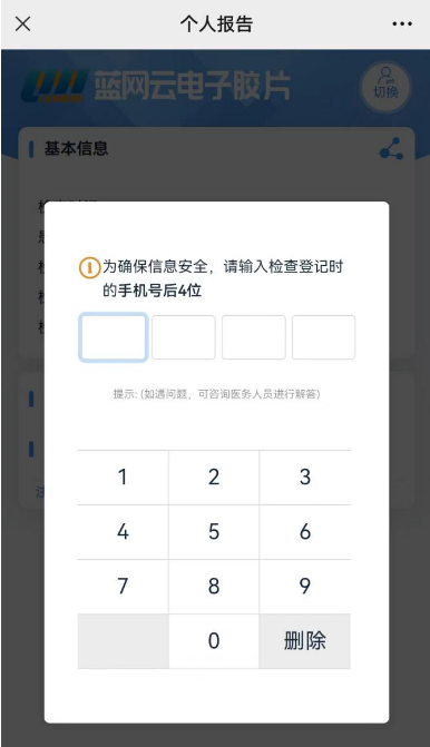 为了保护患者隐私和数据安全,扫描二维码后需要二次验证,患者需要输入电话号码后四位进行二次验证;