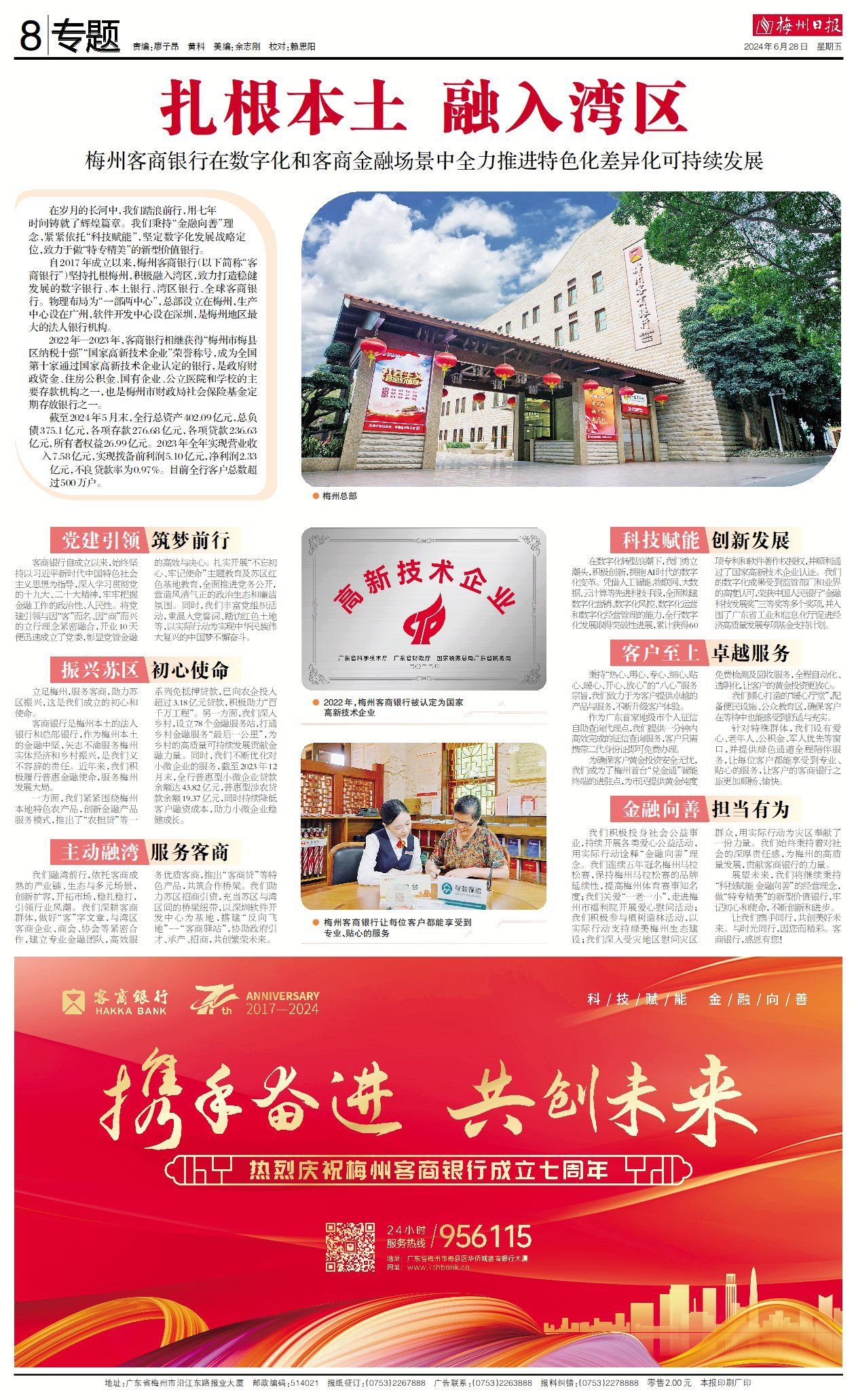 自2017年成立以来,梅州客商银行(以下简称“客商银行”)坚持扎根梅州,积极融入湾区,致力打造稳健发展的数字银行、本土银行、湾区银行、全球客商银行。物理布局为“一部两中心”,总部设立在梅州,生产中心设在广州,软件开发中心设在深圳,是梅州地区最大的法人银行机构。