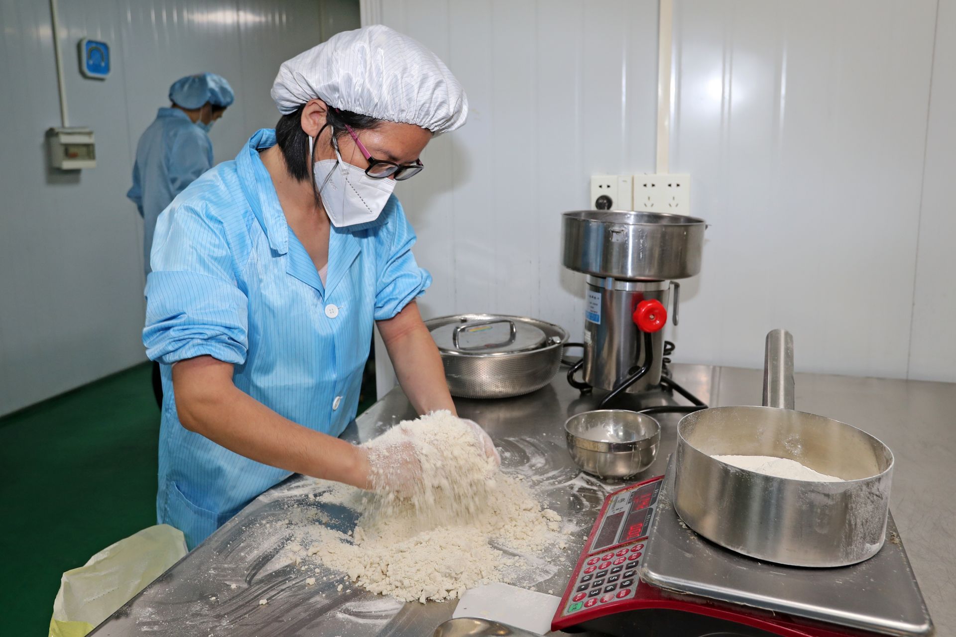 糕味嘉食品有限公司员工正在包装客家传统特色糕点——月光糕。